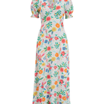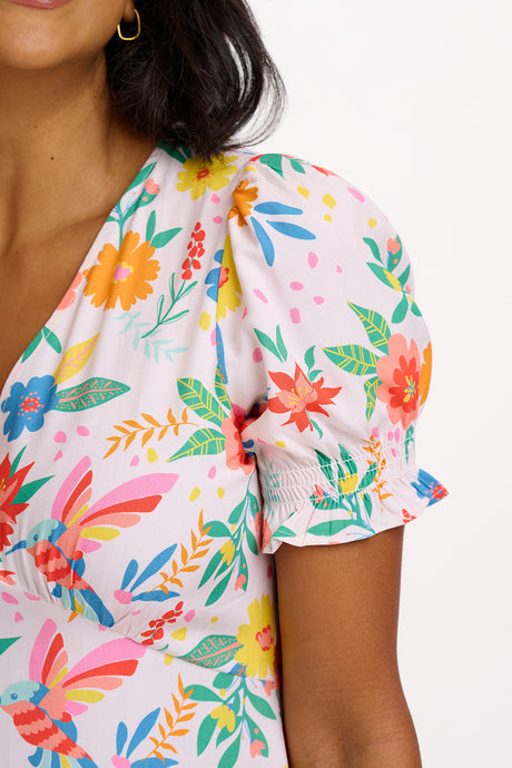 The Maryjane dress features a timeless silhouette with a V-neckline, empire waistline, and charming short cuffs. It's embellished with the vibrant new Tropical Hummingbird print, featuring a charming array of colorful flowers and hummingbirds on a soft off-white background.