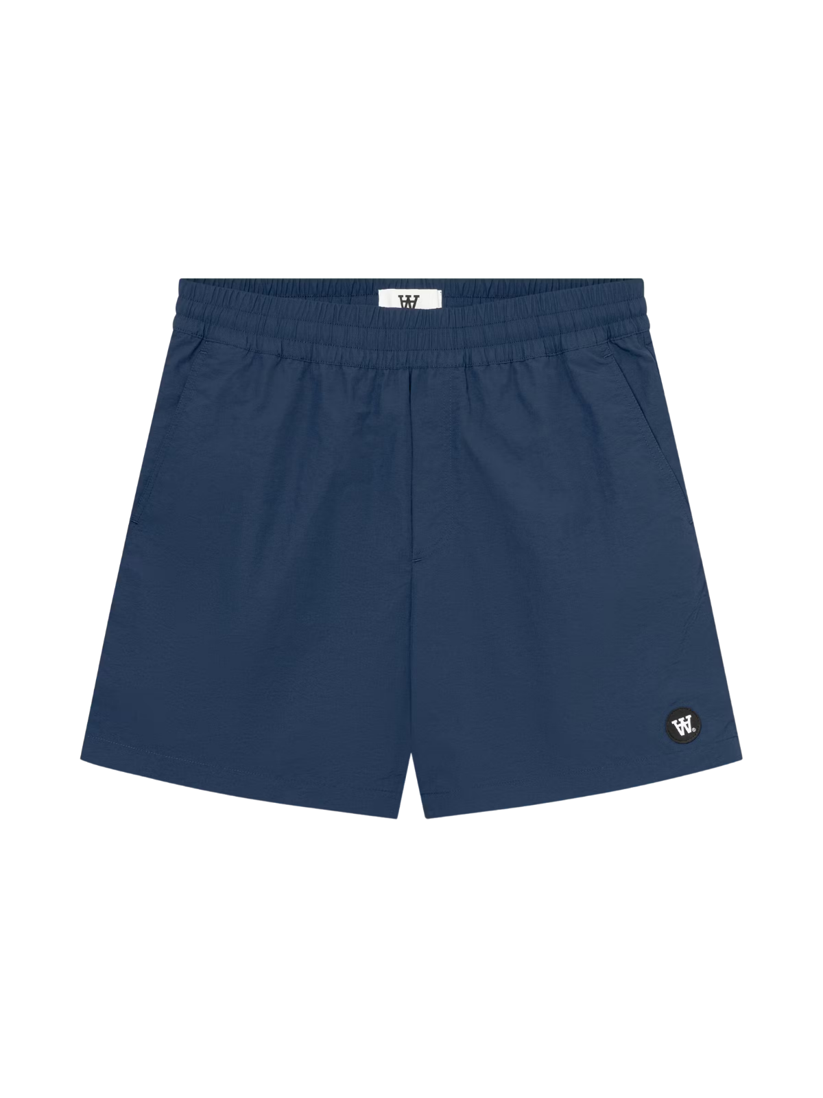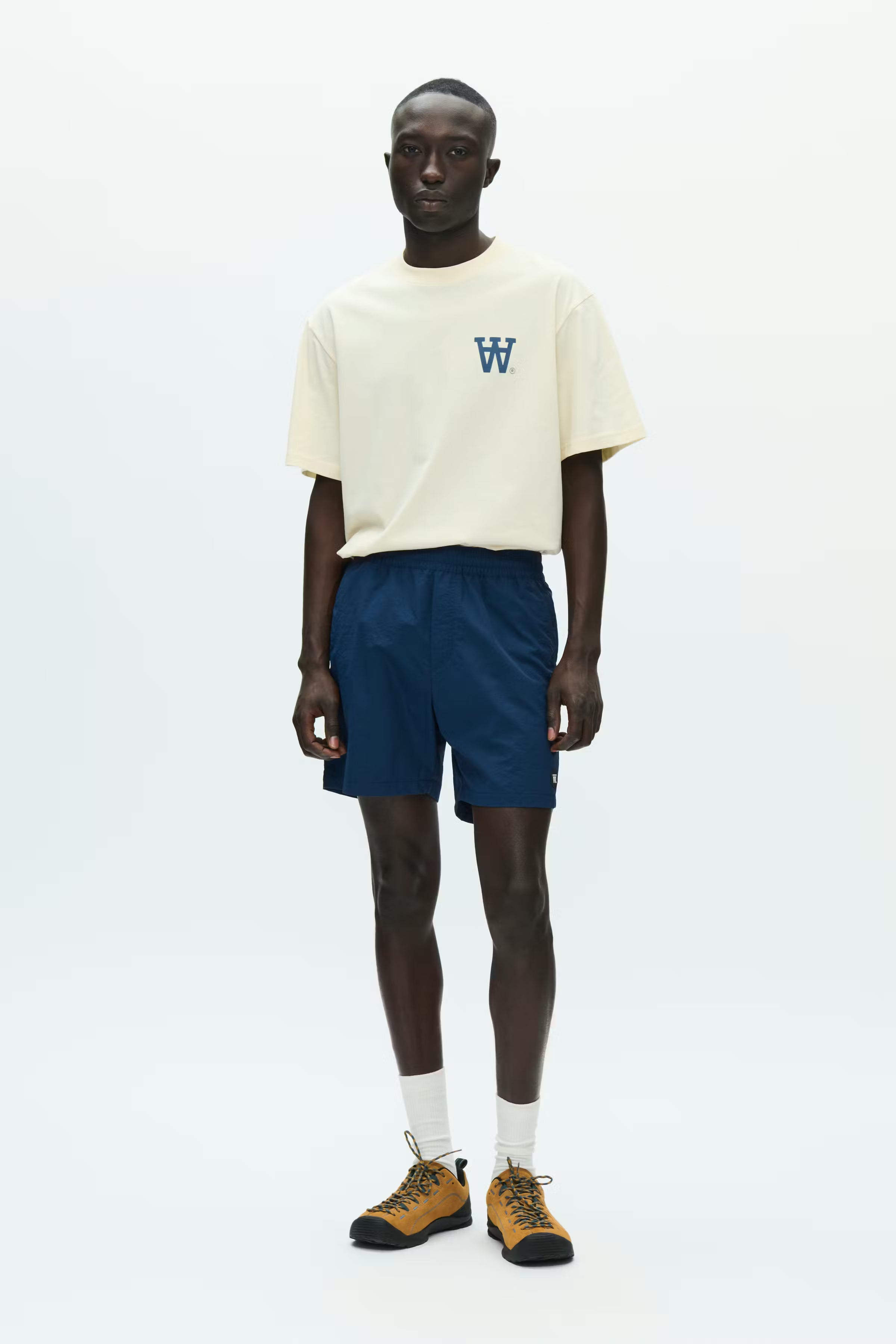 Pantalones cortos con silueta recta, largo por encima de la rodilla, cintura elástica y bolsillos laterales. Presentan un suave acabado mate y un sutil detalle de parche con el logotipo en el dobladillo.