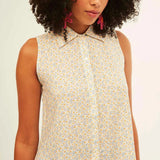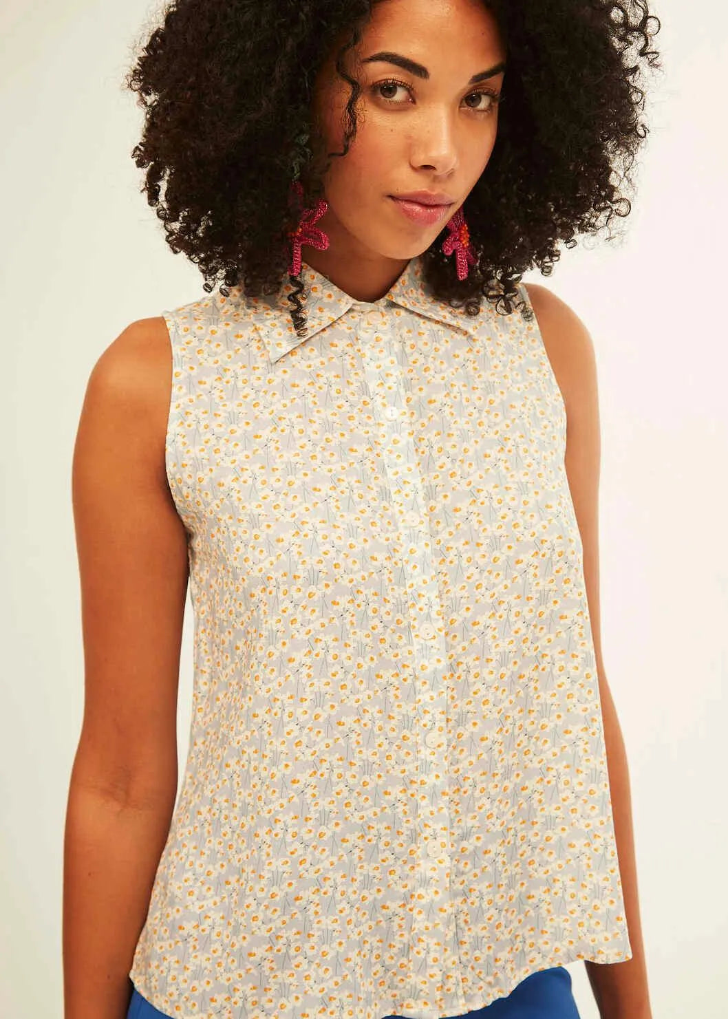 Sleeveless shirt in Gray Daisy print with front button closure.