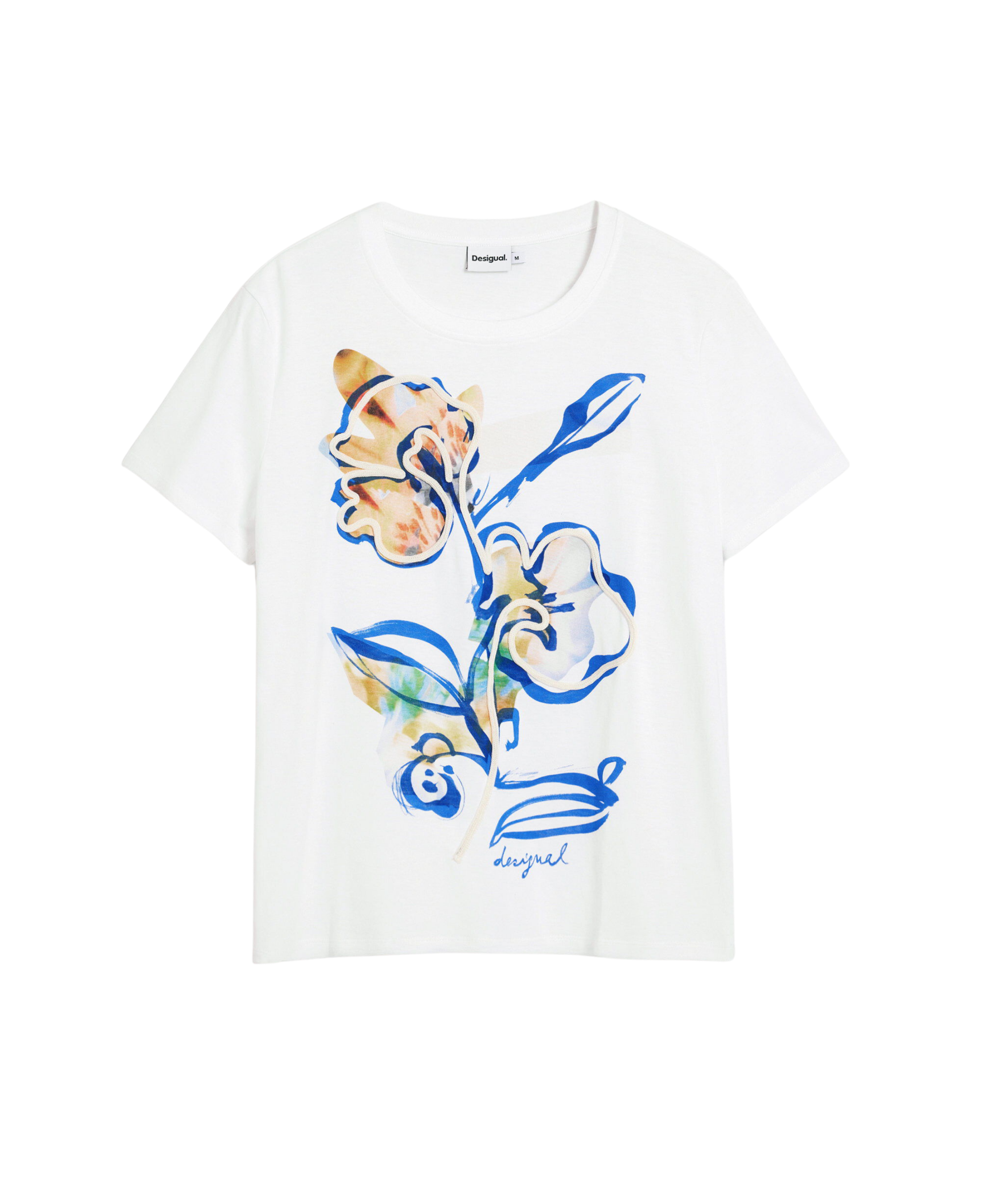 El diseño parte de una construcción clásica de camiseta de manga corta con cuello redondo y fit regular. Esa base contenida hace que el protagonismo recaiga en el estampado digital de flores y en el contraste de color que define el modelo. :contentReference[oaicite:2]{index=2}