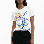 Dentro de una propuesta casual, este modelo se sitúa en el terreno de las camisetas regulares que funcionan bien como fondo de armario, pero con un punto más expresivo. El contraste entre el fondo liso y el dibujo floral hace que resulte fácil de integrar sin quedarse en una camiseta completamente neutra. :contentReference[oaicite:0]{index=0}
