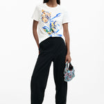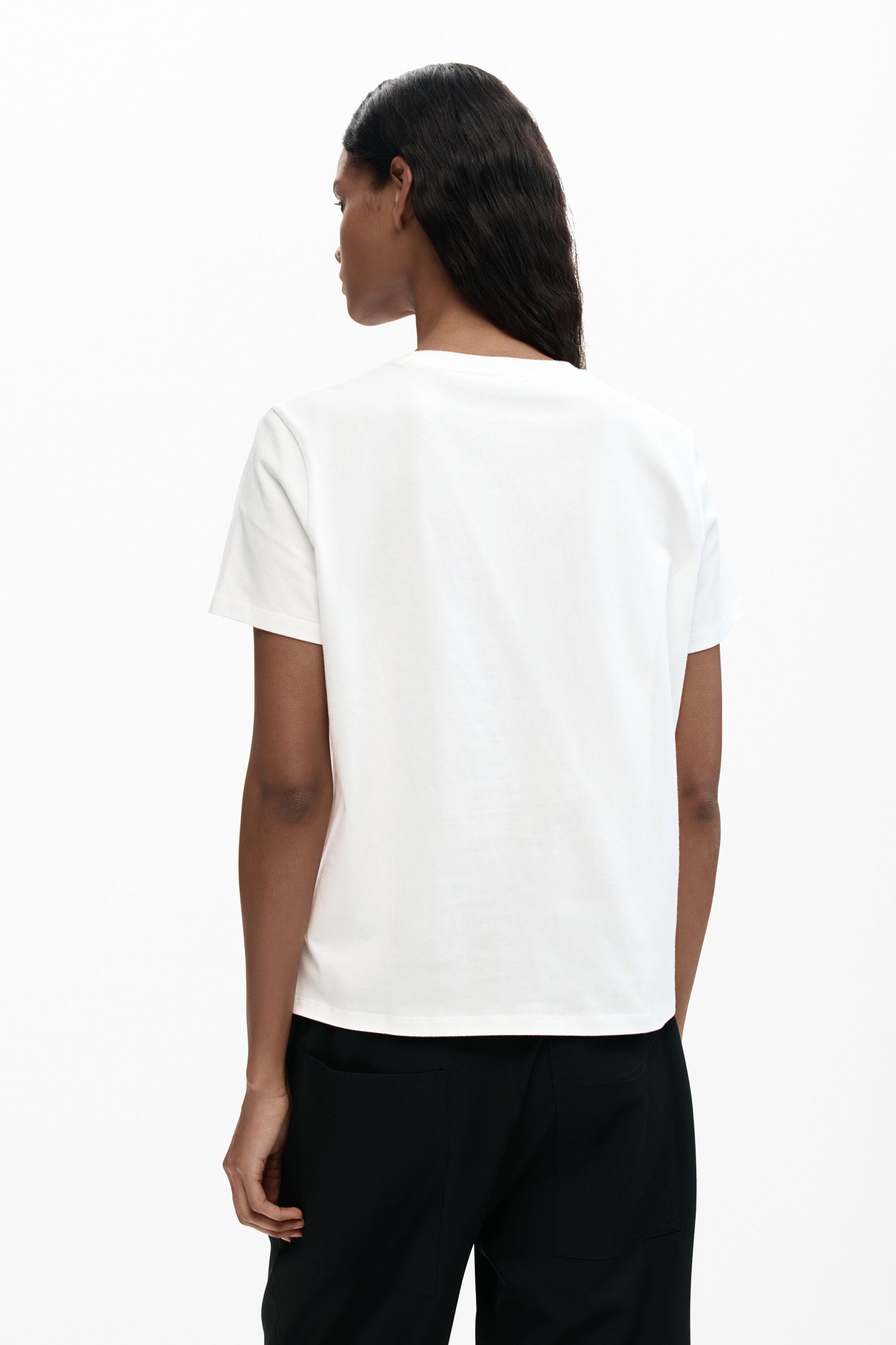 El fondo liso ayuda a ordenar visualmente la prenda, mientras que el motivo floral introduce ritmo y un punto más expresivo sin recargar el conjunto. Es una forma eficaz de dar identidad a una camiseta sin perder versatilidad.