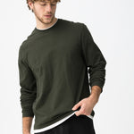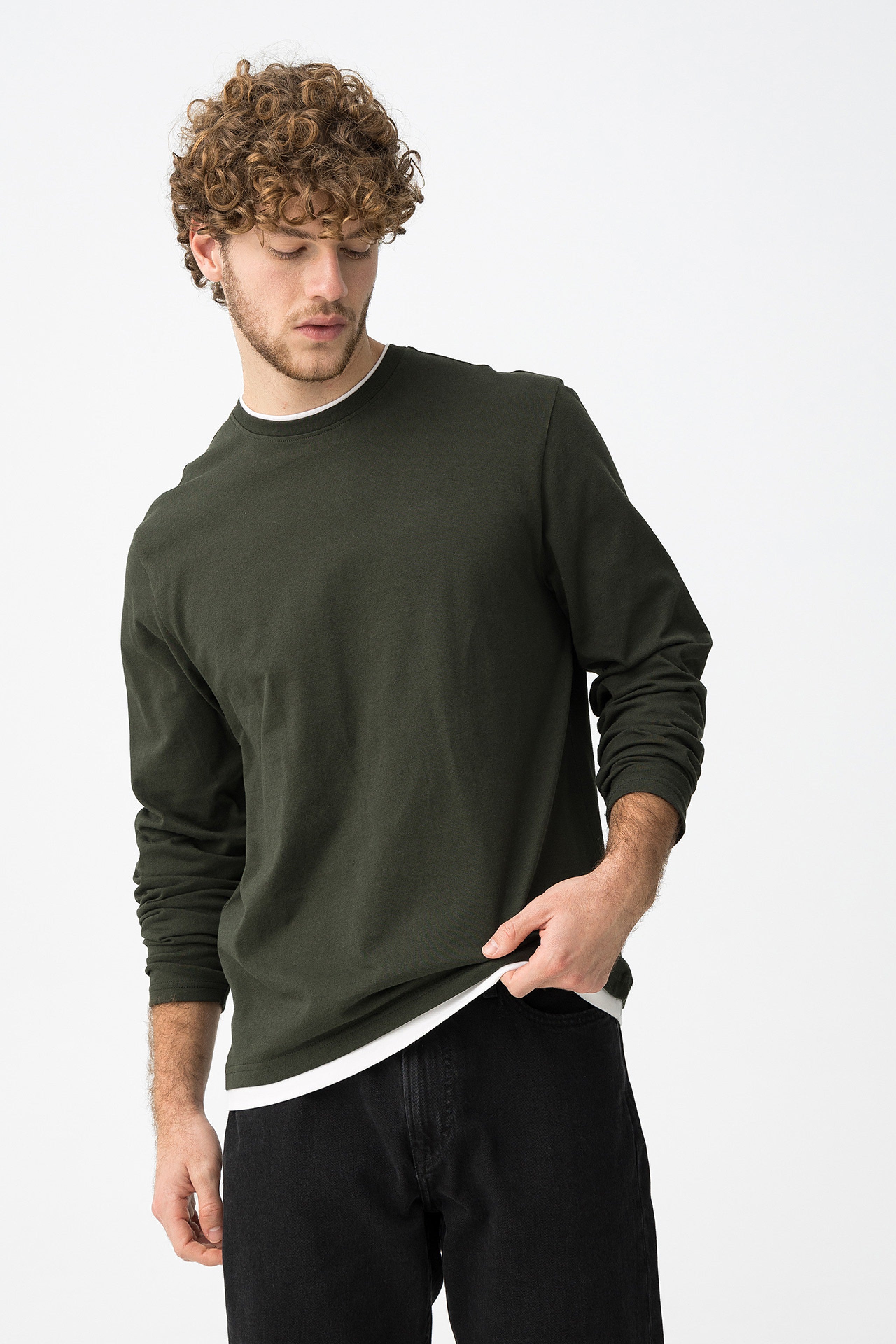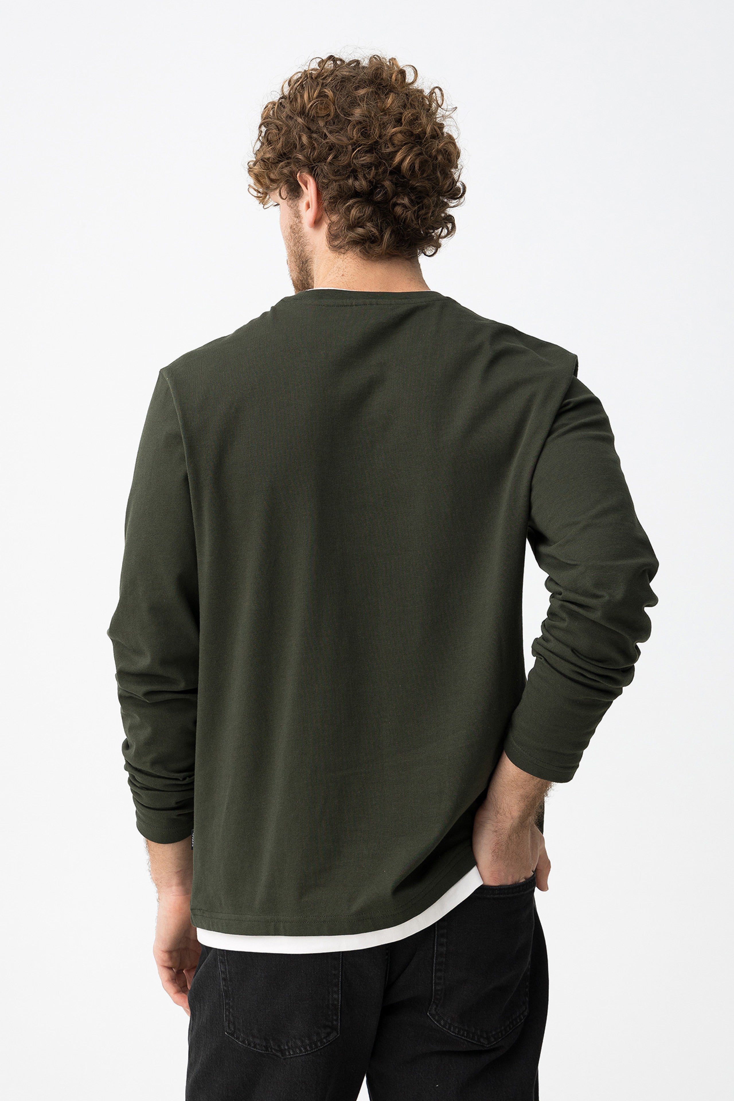 Corte regular en verde oscuro, manga larga, cuello redondo y detalle blanco en el bajo.