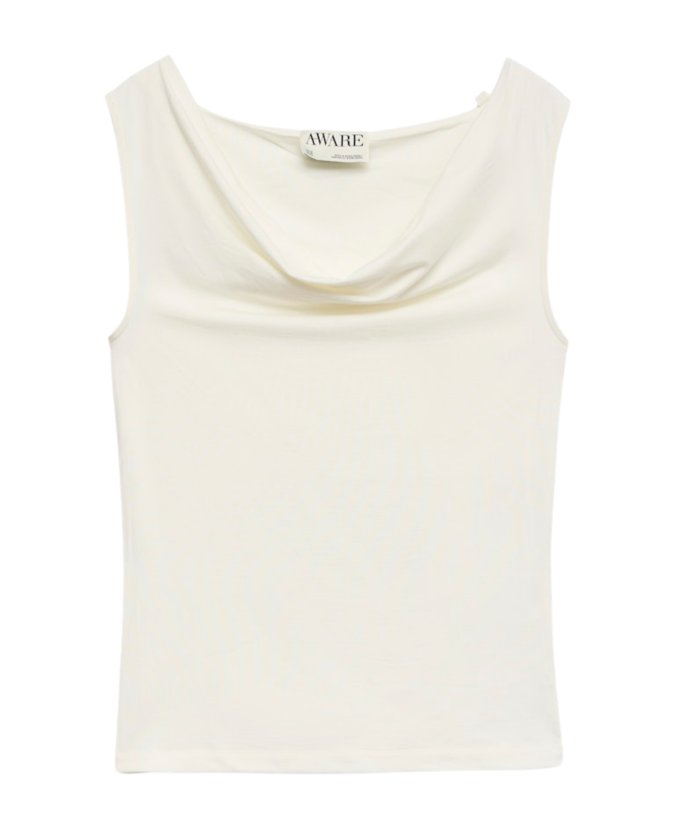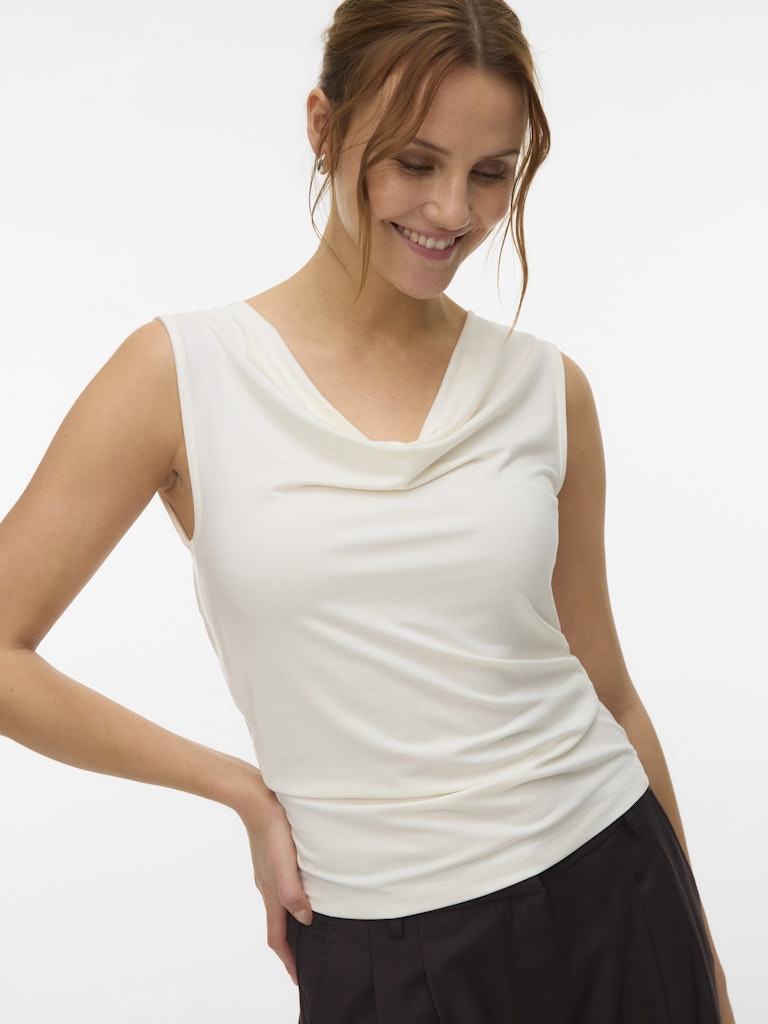 Es un top de mujer ajustado, sin mangas y con cuello drapeado, pensado para looks versátiles con un punto más femenino.