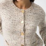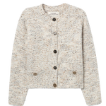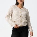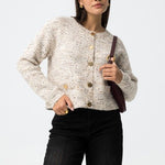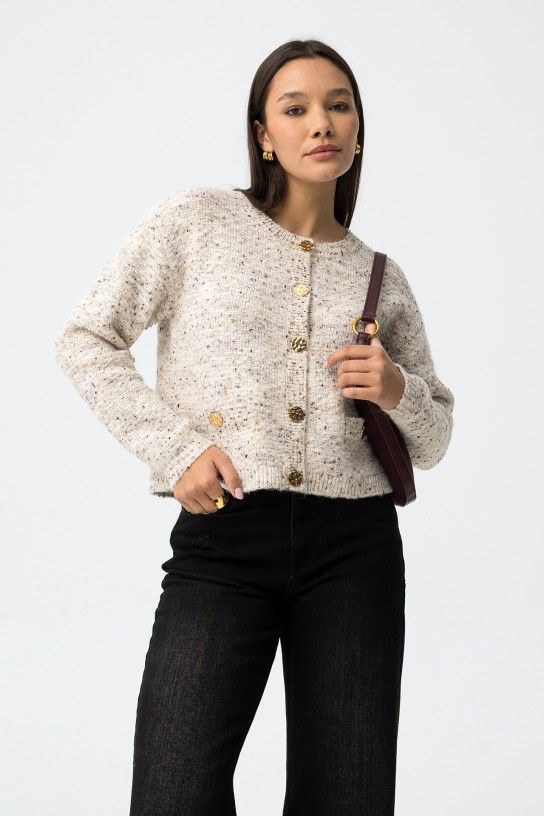 Cárdigan jaspeado de tacto suave y estructura cálida, perfecto para el día a día. Su diseño recto y ligeramente corto aporta un estilo actual sin perder comodidad. Los botones frontales con acabado grabado y los bolsillos delanteros le dan un toque práctico y distintivo.