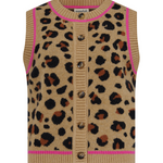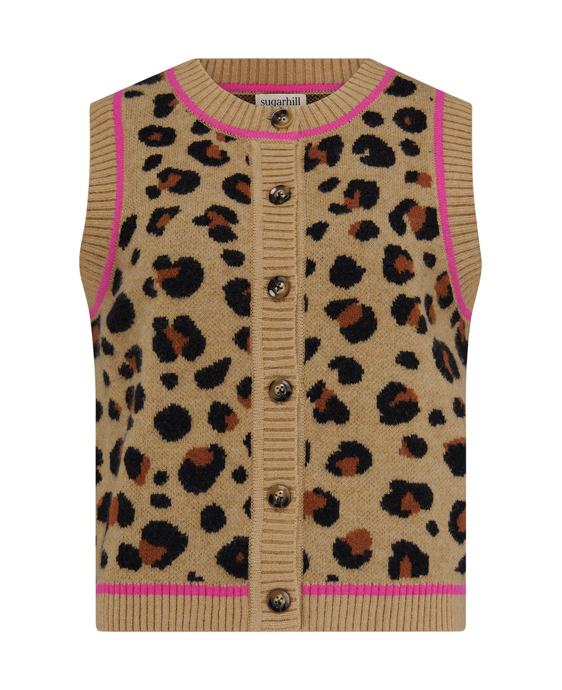 Añade un toque salvaje a tus combinaciones con el chaleco de punto Natalie, confeccionado en un cálido tejido de color tostado con llamativos estampados de leopardo naturales. Este cárdigan sin mangas cuenta con un clásico cierre frontal con botones, un ribete acanalado y un divertido ribete en rosa intenso que le da un toque moderno. Diseñado para combinar fácilmente, es la prenda perfecta para llevar sobre vestidos o camisetas. Un chaleco de punto llamativo que añade textura y estampado a cualquier conjunto.