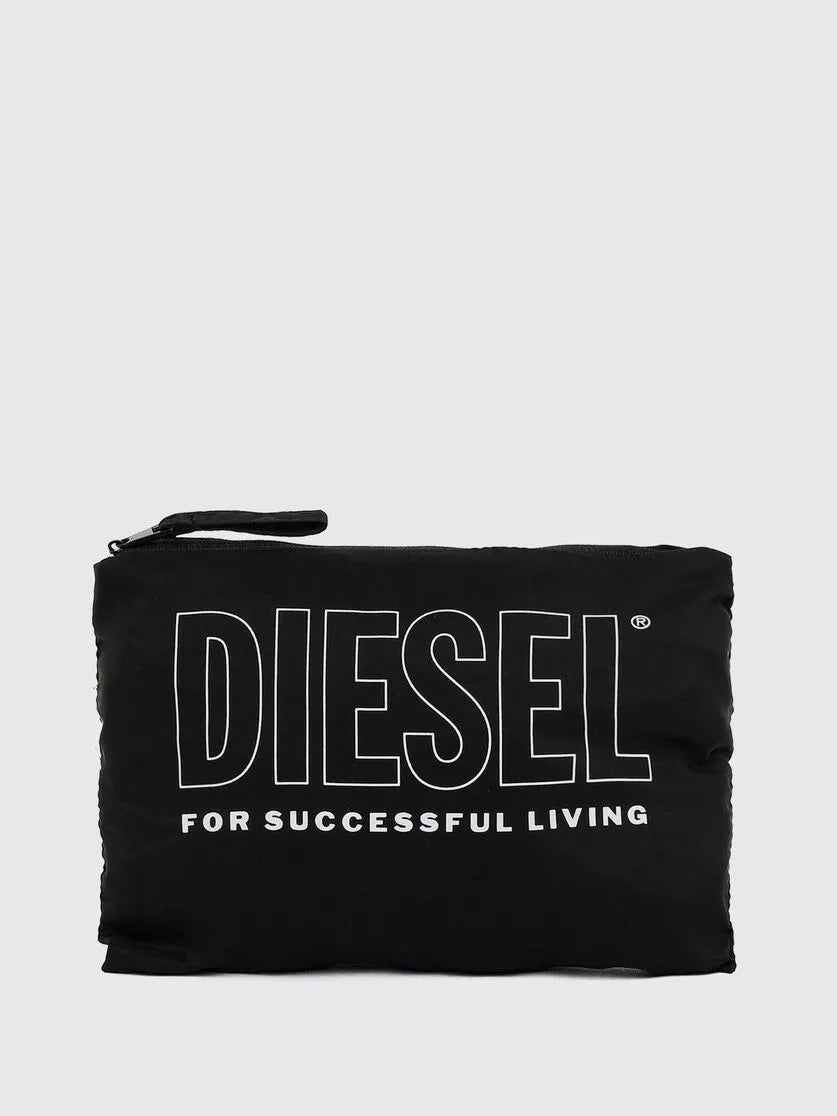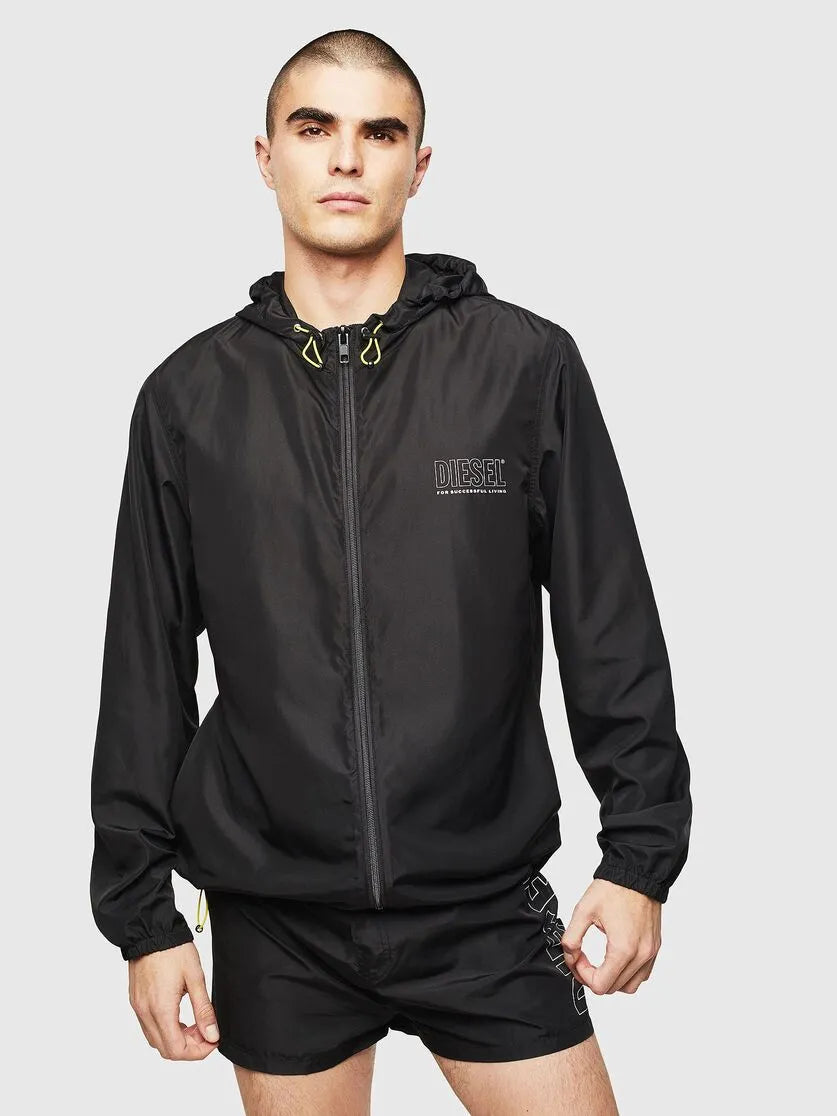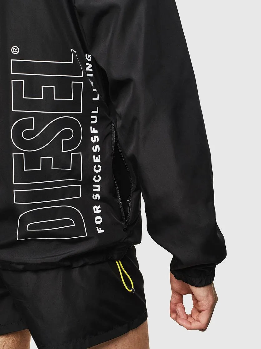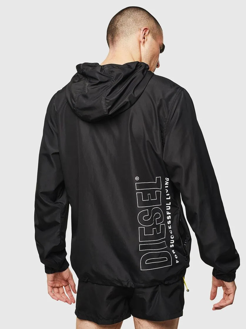 Lightweight polyester hooded windbreaker jacket with stamped Diesel logo print on the chest and back. Folds up and stores in a zippered bag.