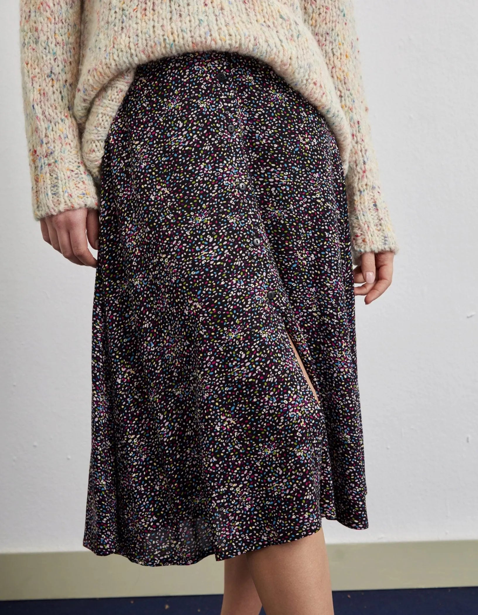 Ankle-length skirt with retro print. Straight cut with front button closure.
