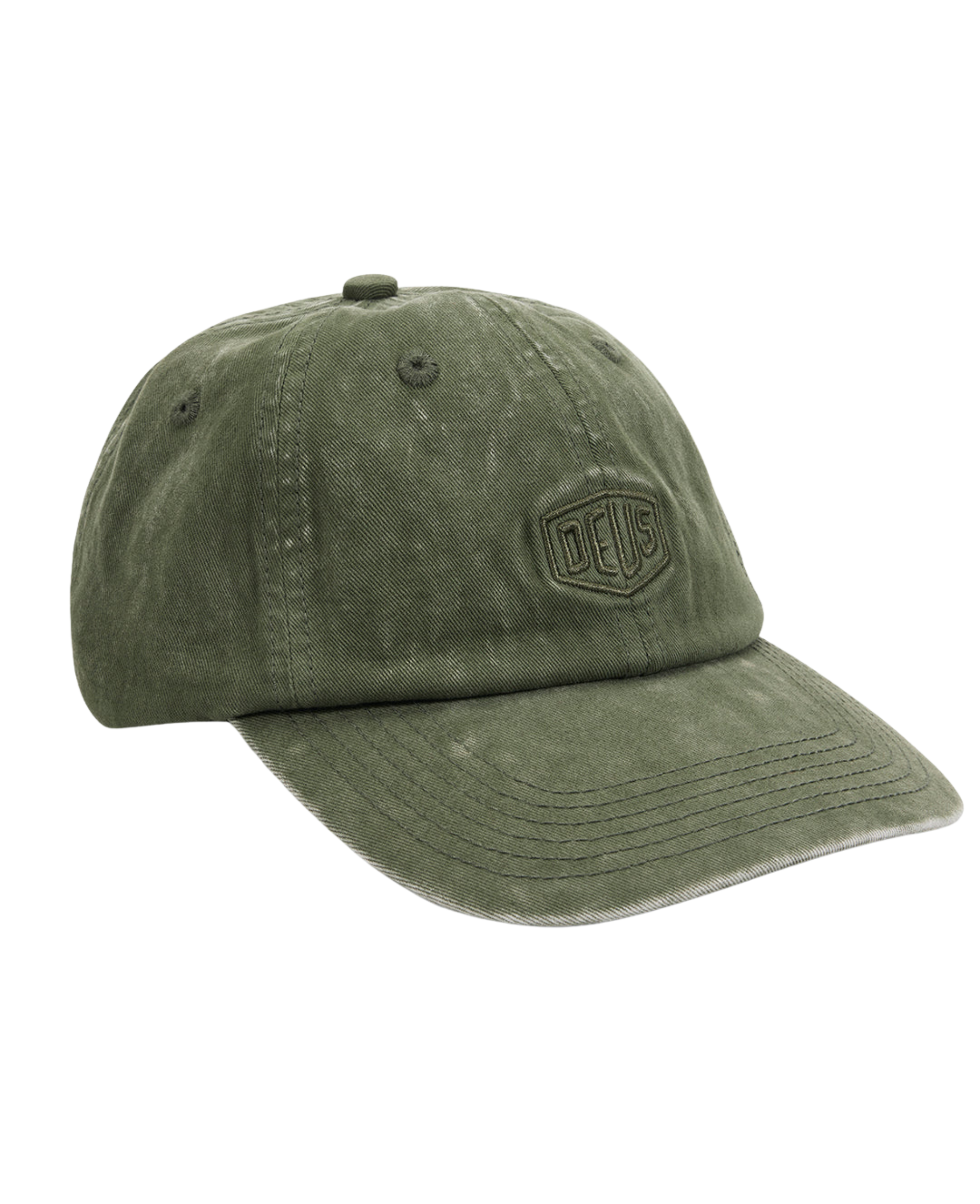 La gorra Deus Shield no necesita traducción: esta gorra tipo dad cap teñida en prenda lleva el emblema que alimenta aventuras sin fin.