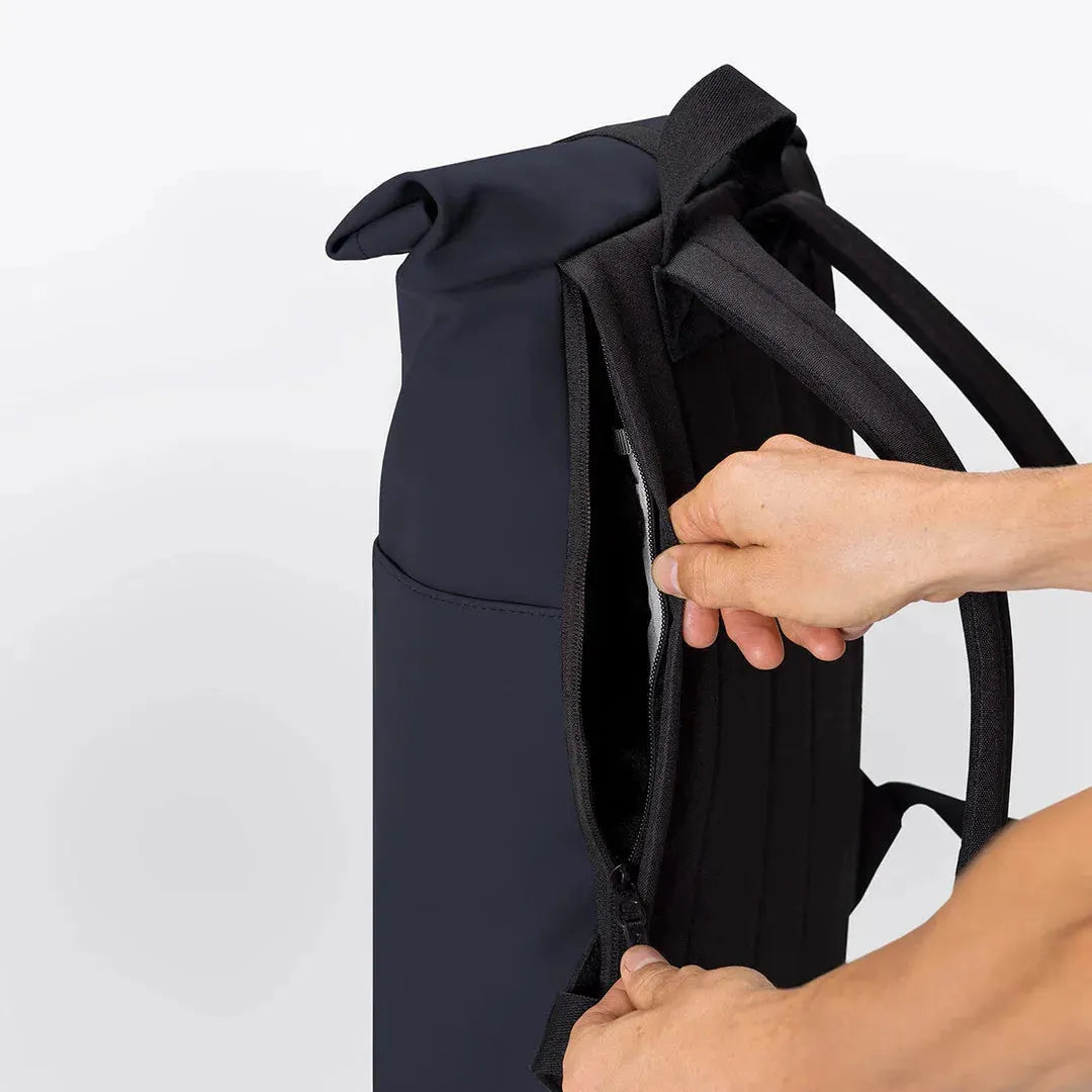 This minimalist backpack is the smaller version of the Hajo Medium Backpack (about a quarter smaller). Whether on a bike trip, shopping or in the evening, it is suitable for any occasion. The roll-top lid closes with a Velcro fastener and allows for convenient packing of the Hajo Mini Backpack, which has a zipped compartment on the outside.