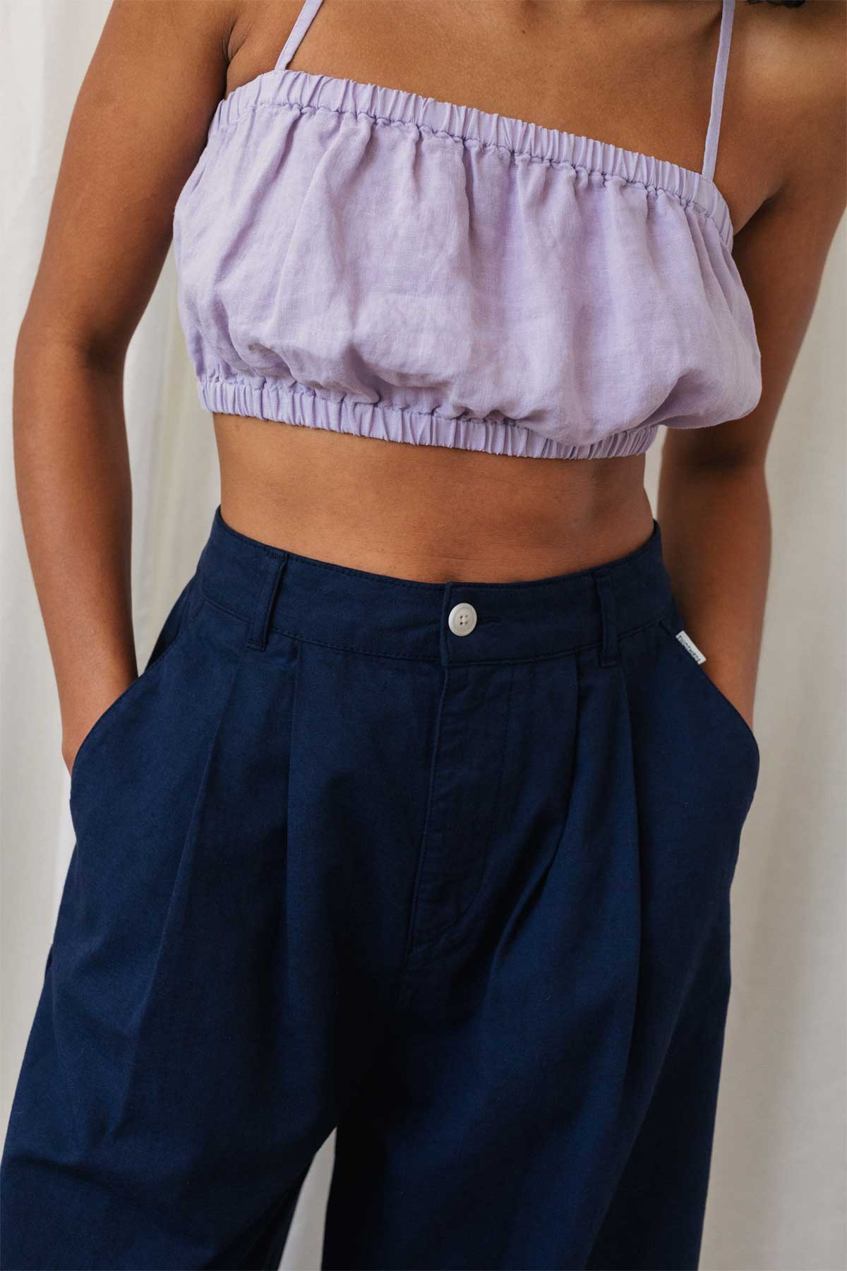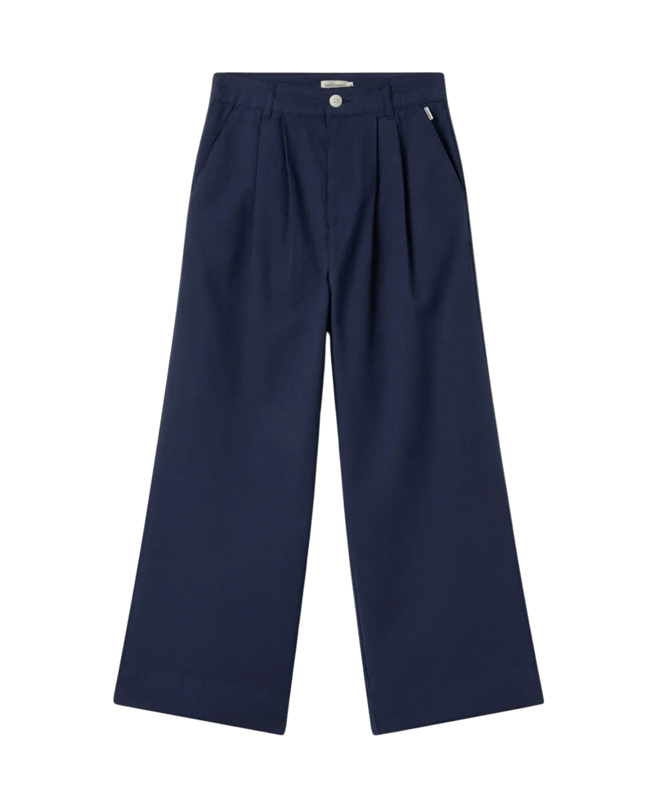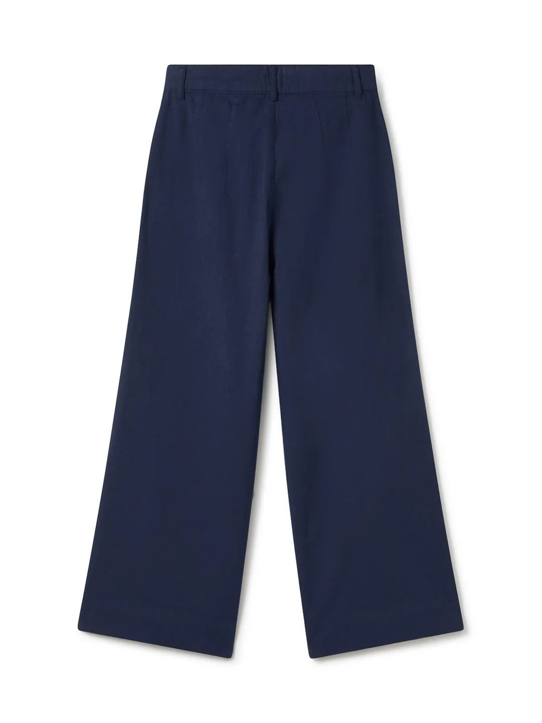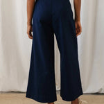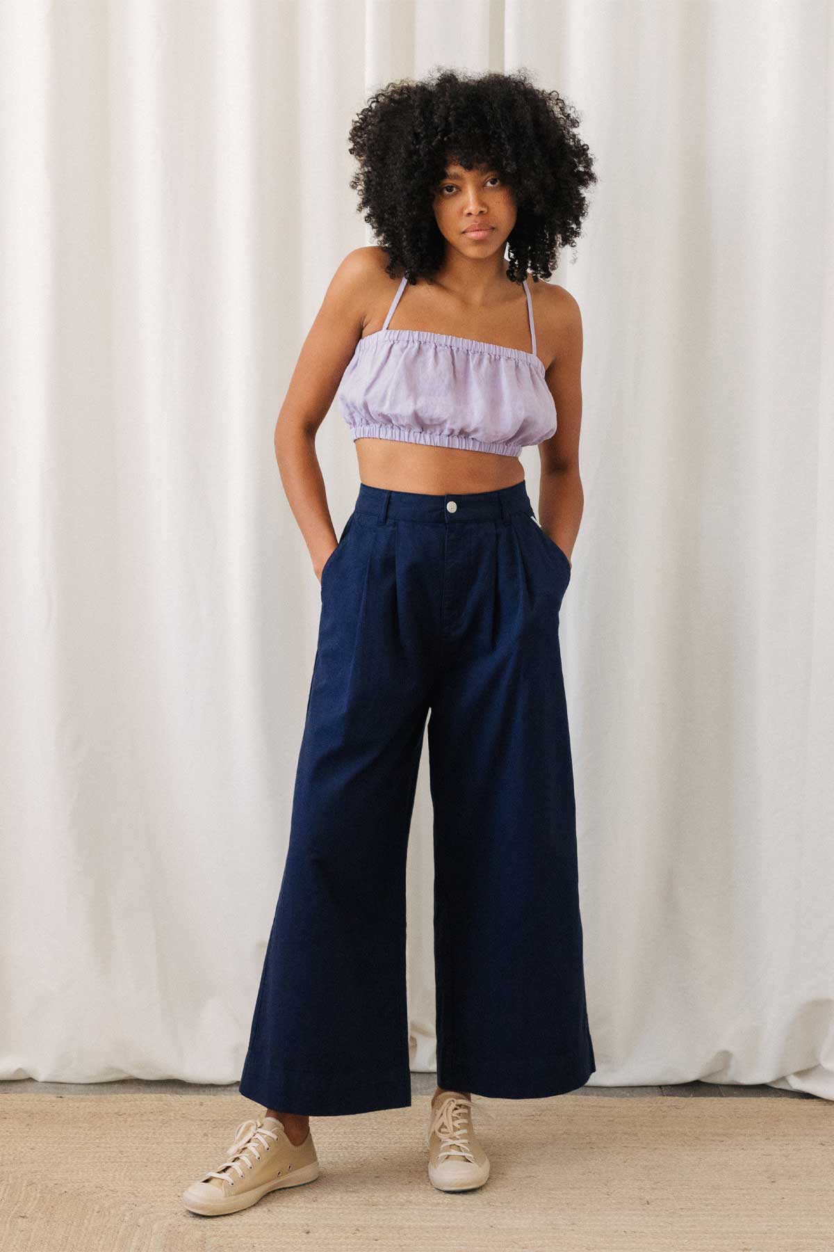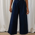 These palazzo pants are crafted from a durable yet stylish low-impact canvas fabric, making them the perfect transitional piece. They feature side pockets, back darts, and pleats at the front.