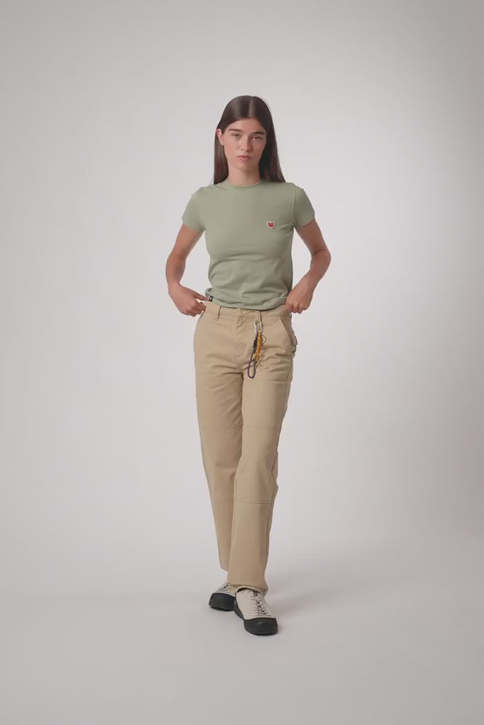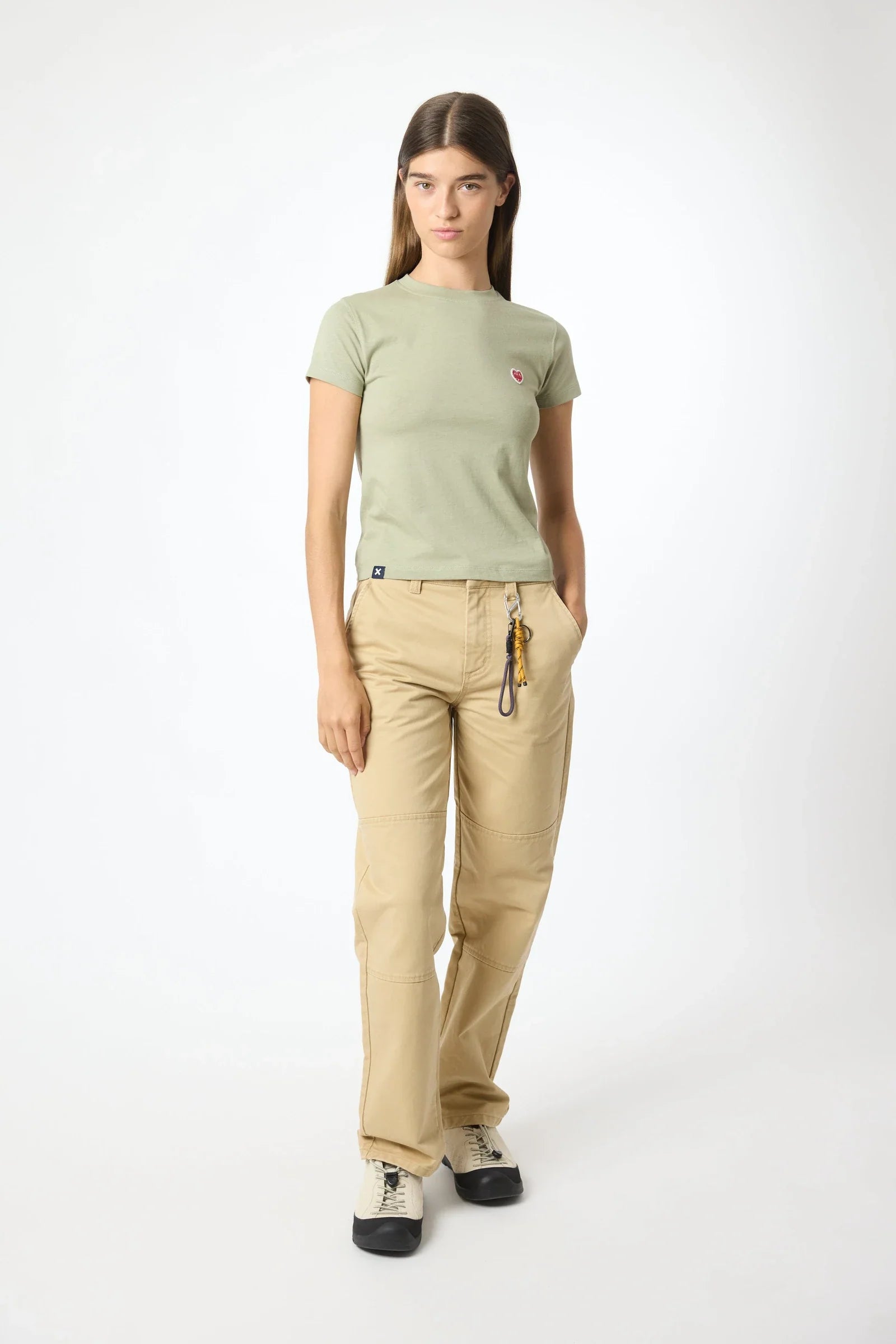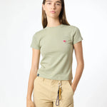 La Sage Heart Woman Tee de Blue Banana es una camiseta femenina de manga corta confeccionada en 100 % algodón orgánico, con estilo crop fit que aporta un corte moderno y favorecedor. Presenta un parche decorativo en forma de corazón en el pecho que añade un detalle gráfico sutil pero distintivo. La tonalidad sage le confiere versatilidad y elegancia relajada, perfecta para combinar con prendas de tiro alto o look urbano minimalista.