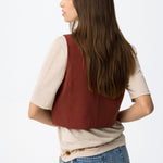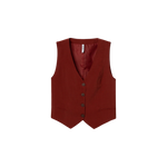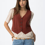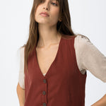 El diseño parte de una construcción muy clara y bien resuelta. El escote pico alarga visualmente la silueta, mientras que el cierre frontal con botones refuerza el carácter de chaleco y ordena la prenda de manera natural.