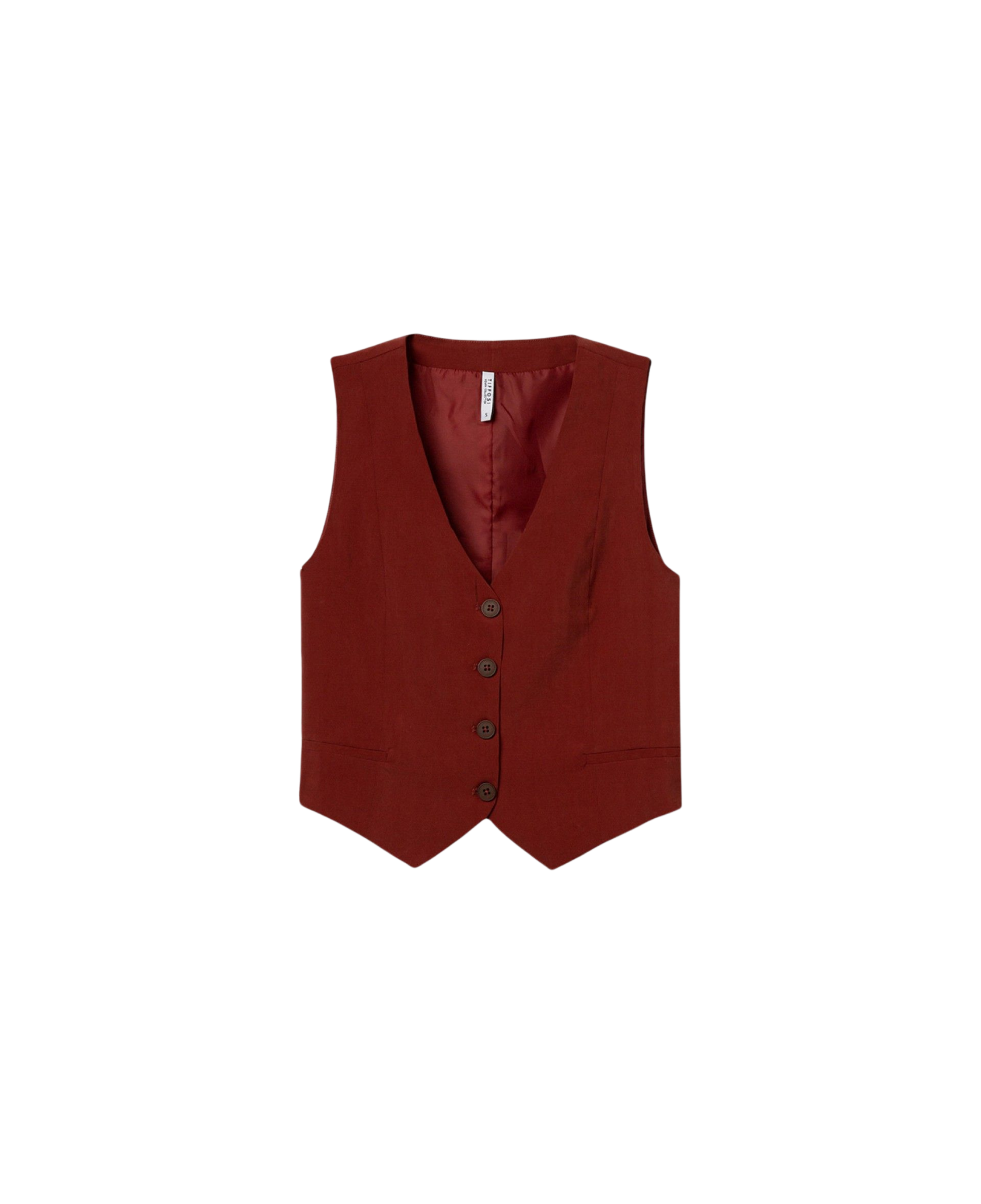 Este chaleco de Tiffosi propone una lectura más pulida y femenina dentro de una silueta corta y entallada. Es una prenda pensada para funcionar tanto como pieza principal como dentro de un conjunto más construido, con una presencia clara pero fácil de integrar.