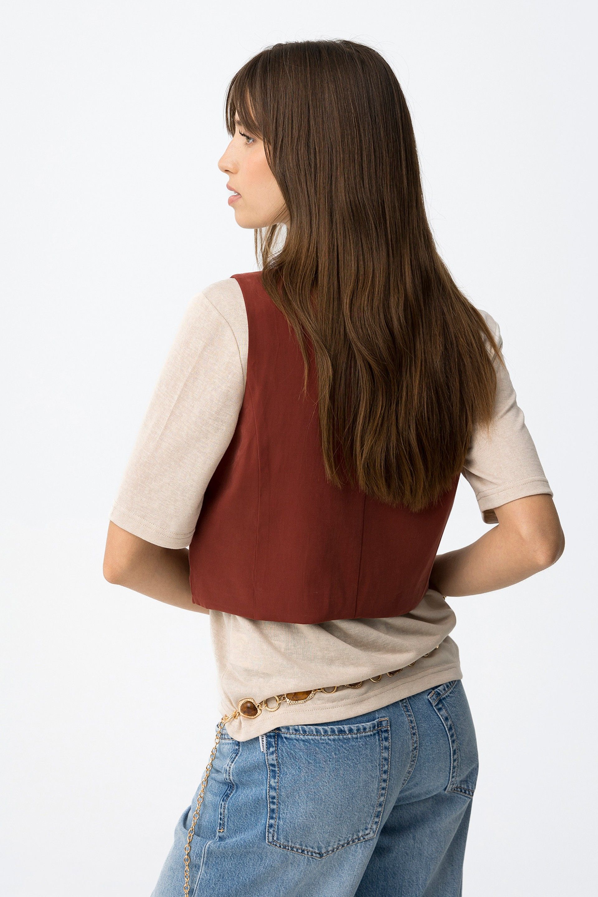 Es un chaleco corto con escote pico y cierre frontal con botones.