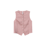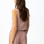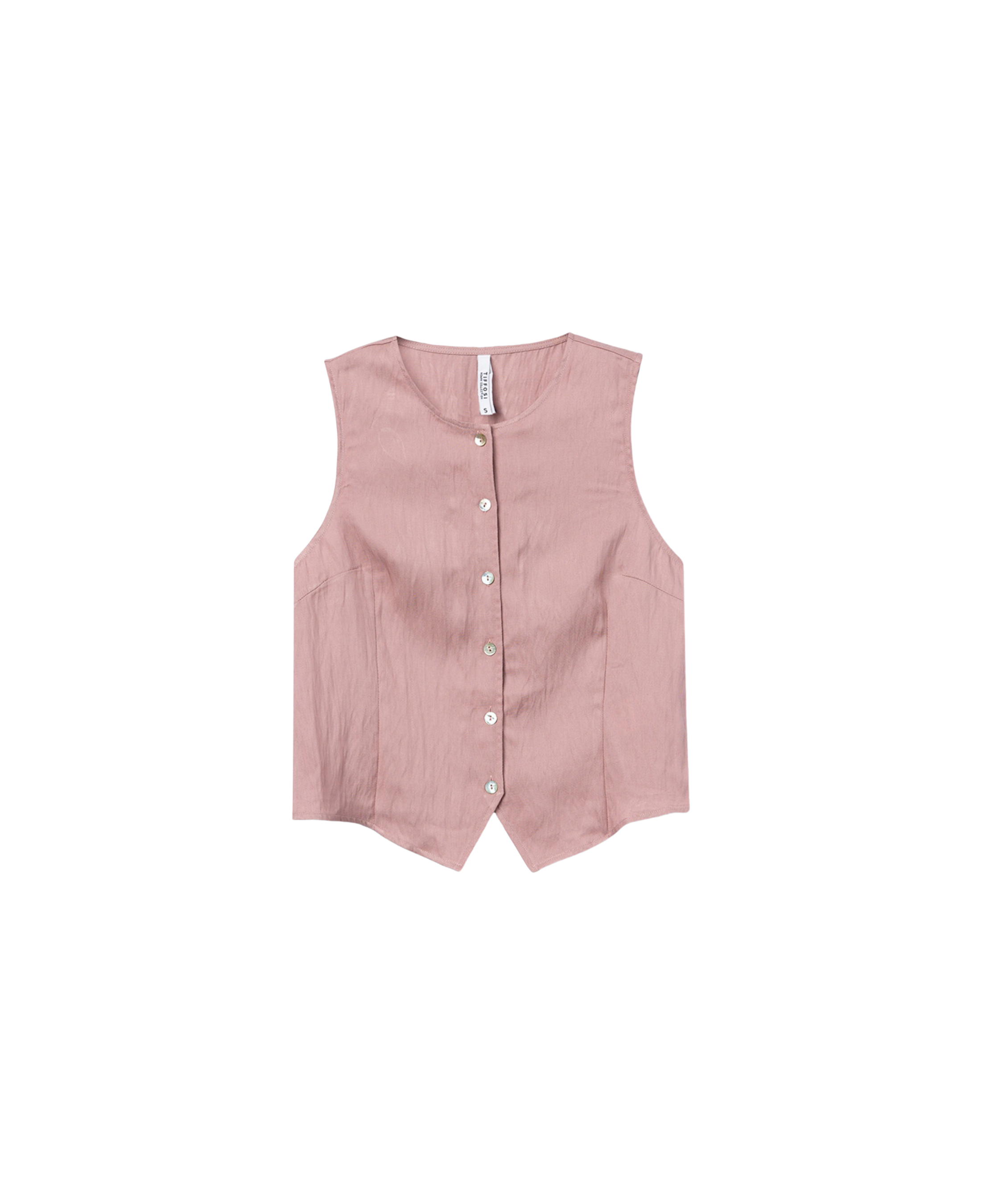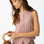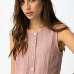 Los botones delanteros ordenan visualmente la pieza y le aportan un carácter algo más trabajado que el de un top liso convencional. El detalle de pico en el bajo introduce una variación sutil en la línea inferior y ayuda a estilizar visualmente la prenda.