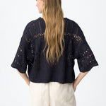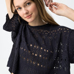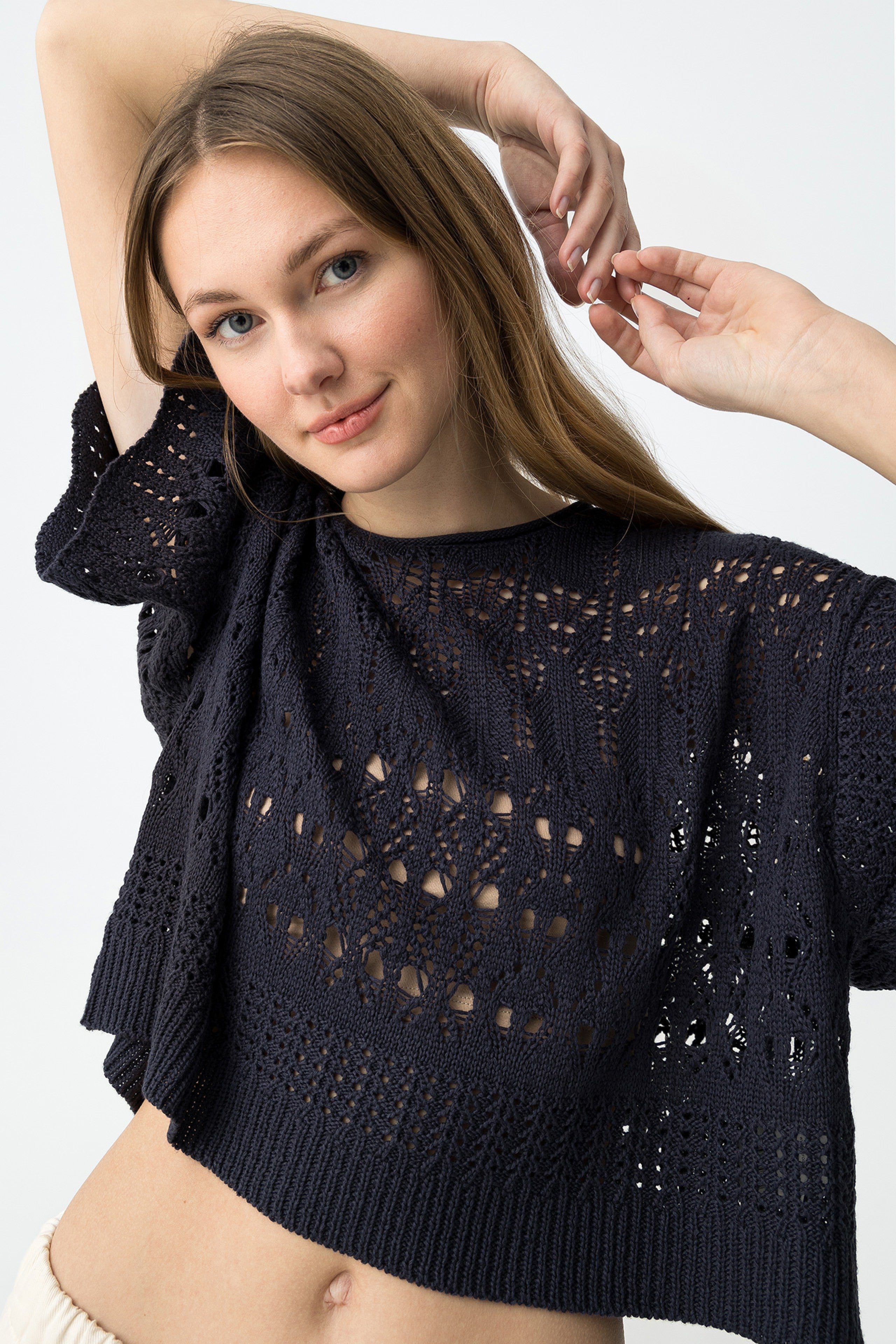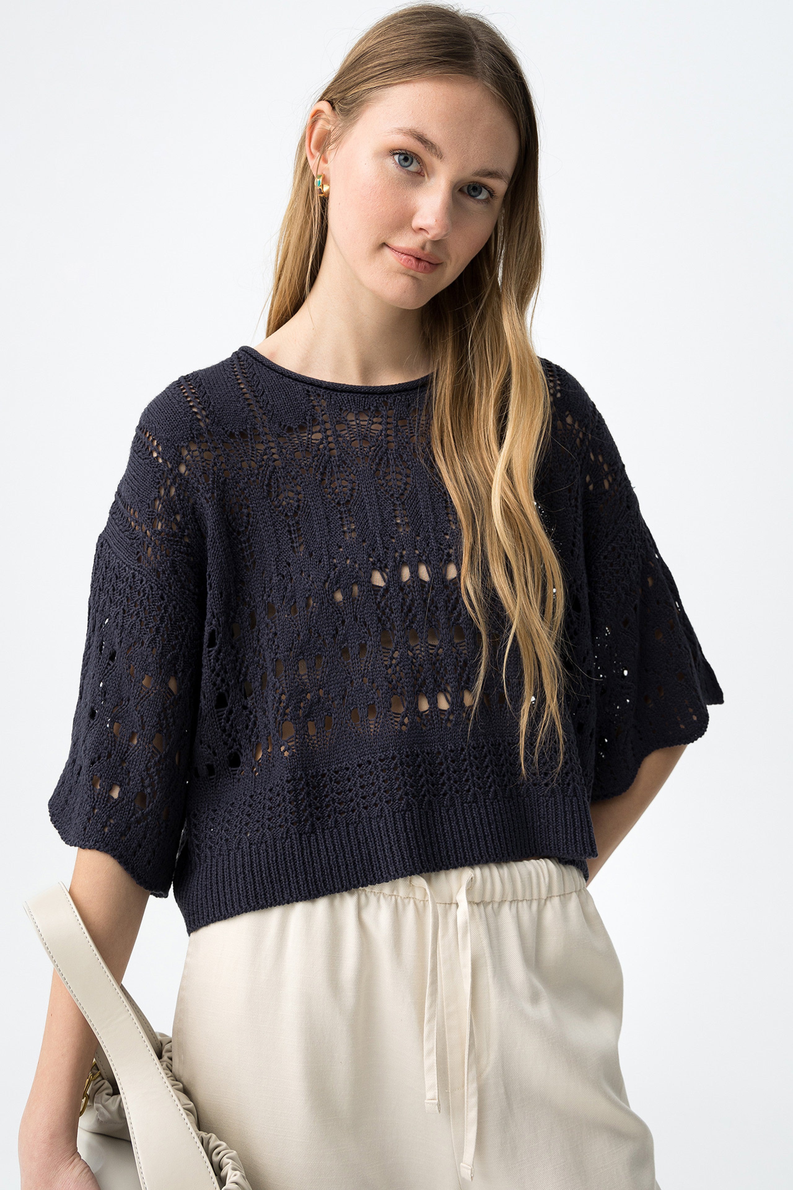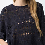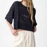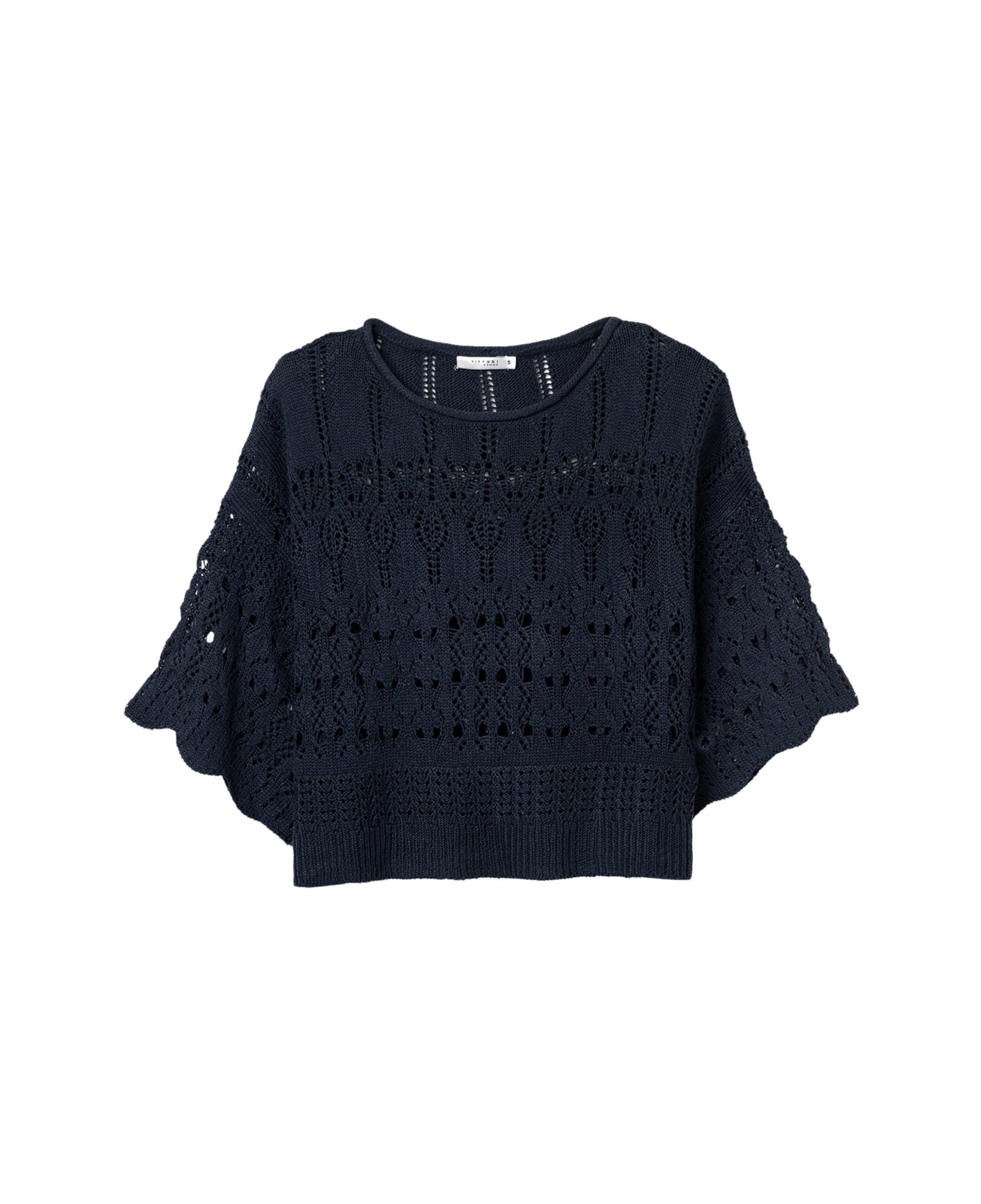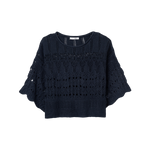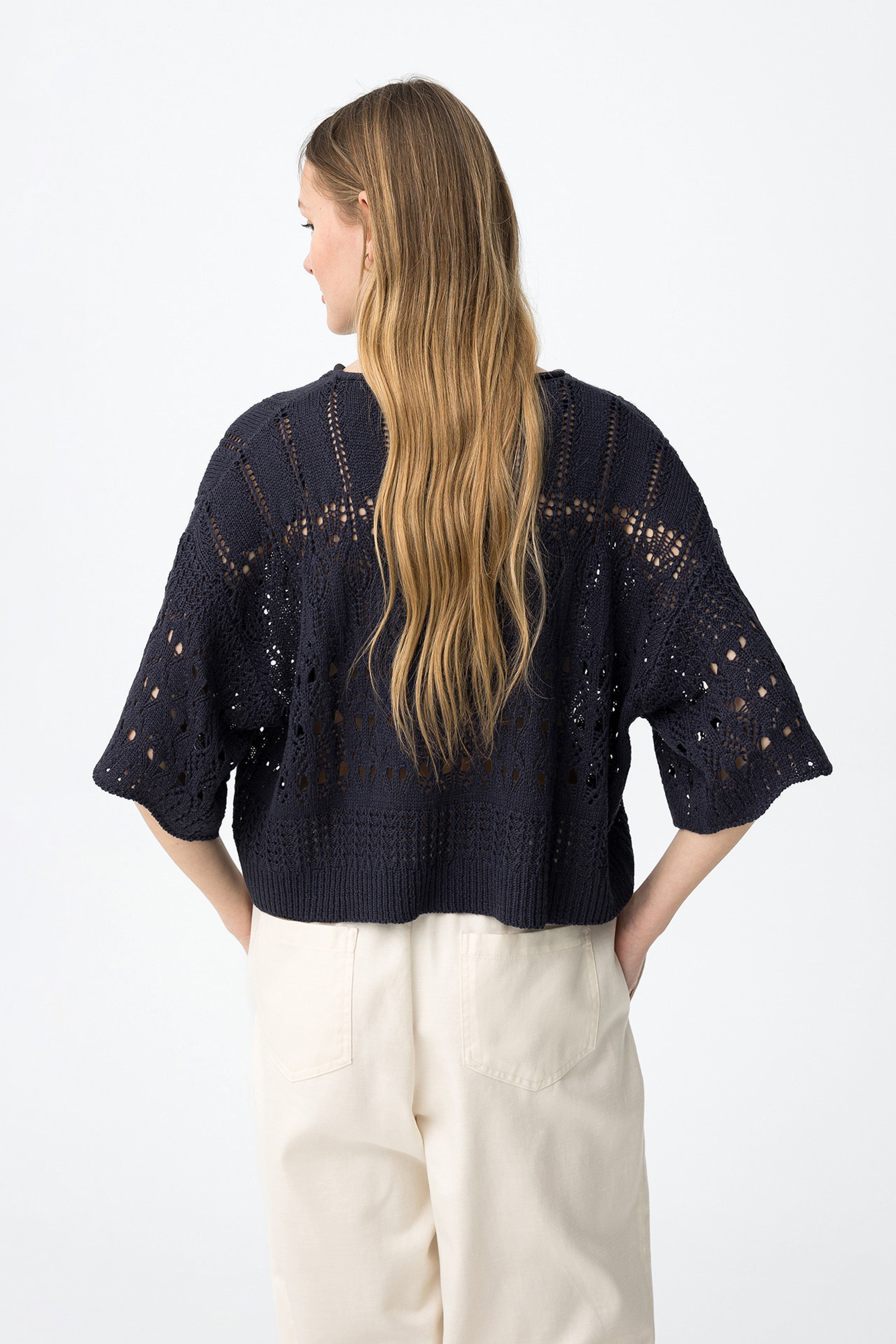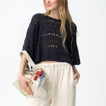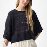 La combinación de punto calado, manga corta amplia y volumen relajado marca claramente su diseño.