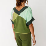 Suéter de hombros caídos con cuello de pico y efecto color block. Hecho de punto ligero de algodón orgánico con certificado GOTS.