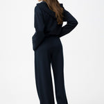 Pantalones anchos de color azul oscuro, talle alto y costura marcada en la parte delantera.