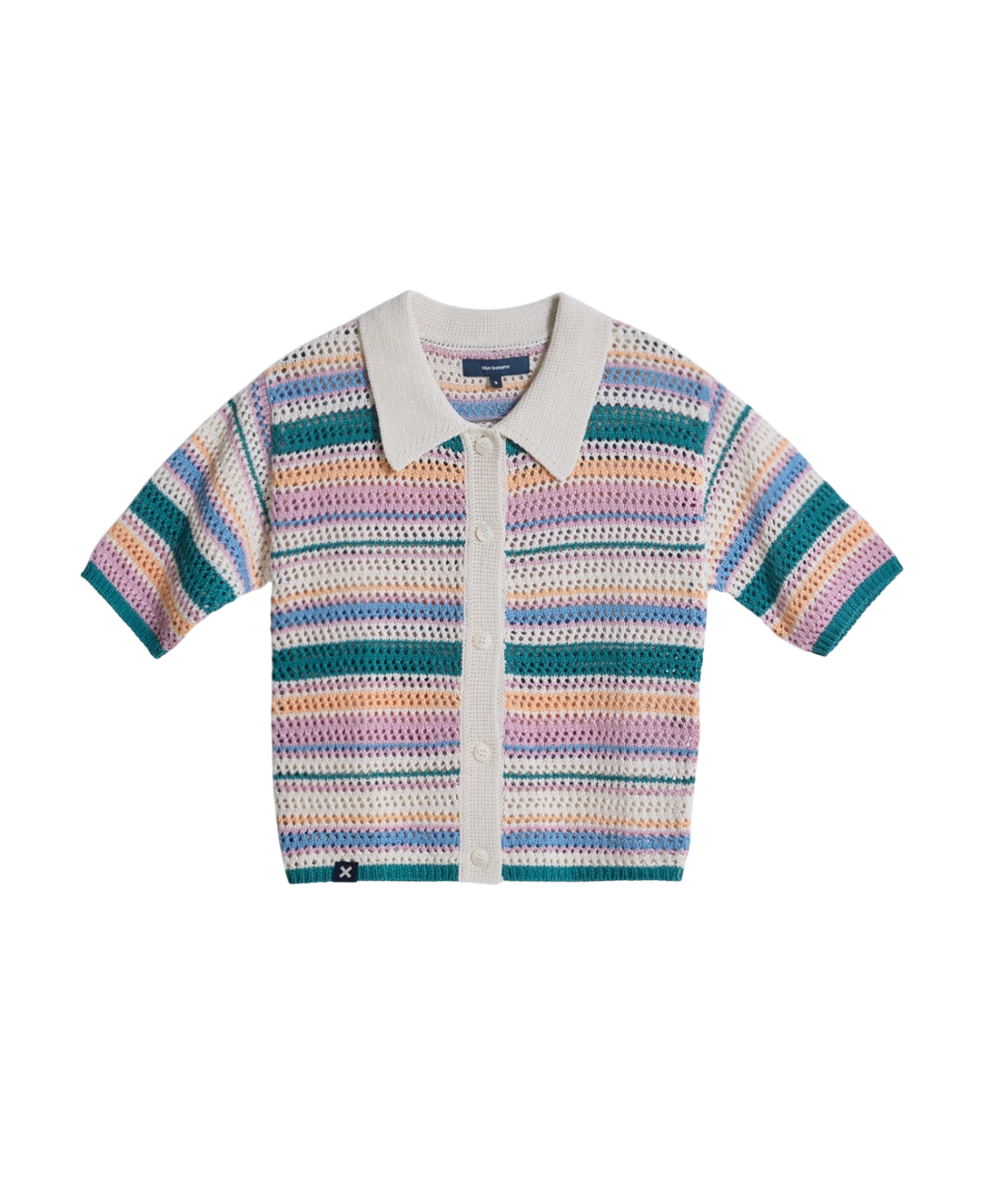 El cárdigan presenta un patrón de rayas multicolor en el tejido, que aporta carácter visual manteniendo una estética equilibrada. Además, incorpora cuello camisero y cierre frontal con botones personalizados, elementos que refuerzan su estilo casual con inspiración vintage.