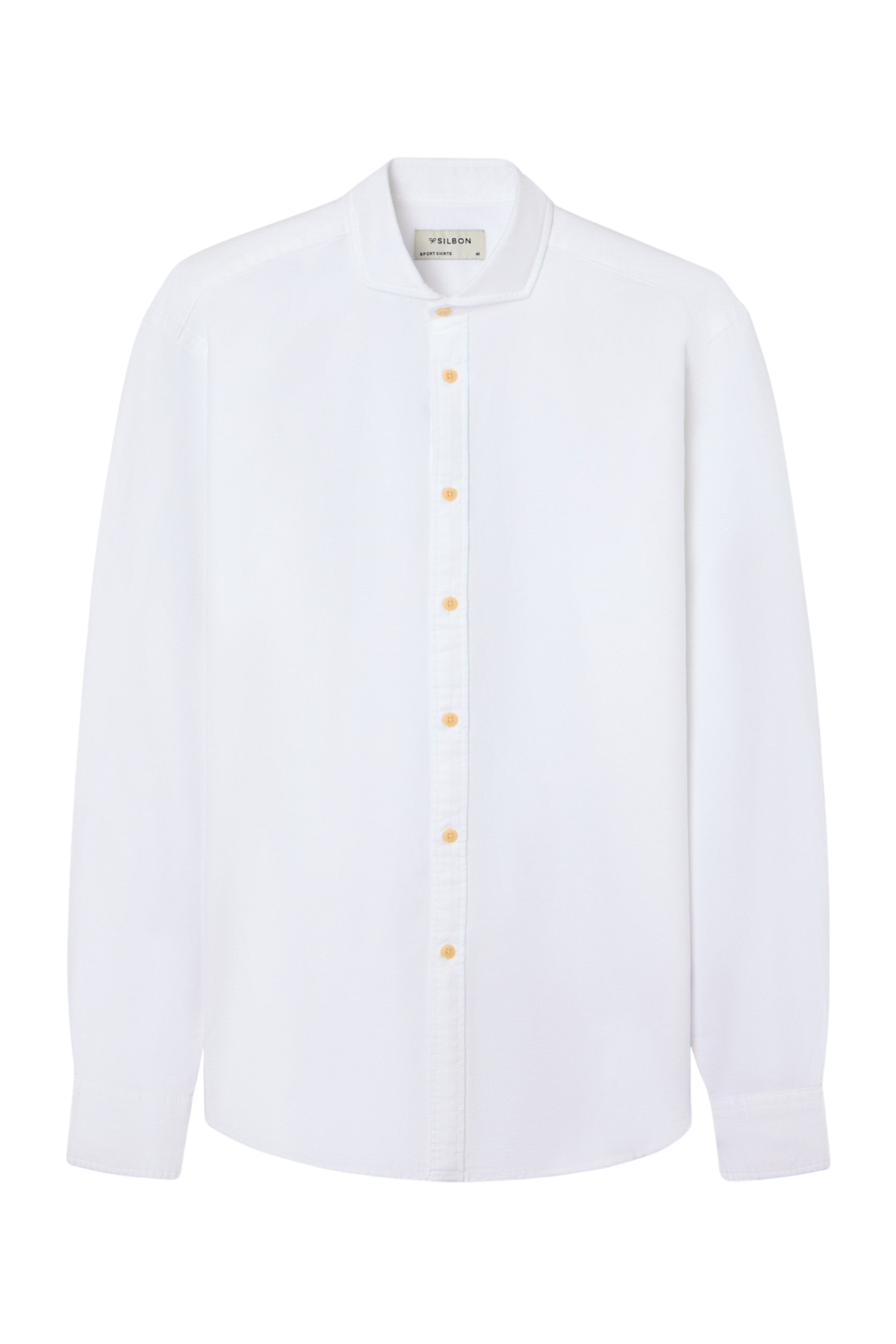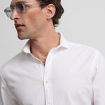 Camisa sport estructura lisa confeccionada en 100% algodón de corte Slim fit. Presenta cuello cutaway y manga larga de puño con botones. Cuenta con raquetas bordadas al tono en el torso.