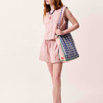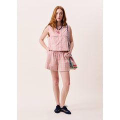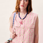Chaqueta sin mangas con estampado de cuadros vichy en rosa y beige y cierre central con botones.