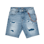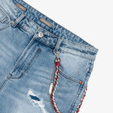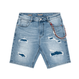 Pantalones cortos o bermudas vaqueras con rotos y complementos.