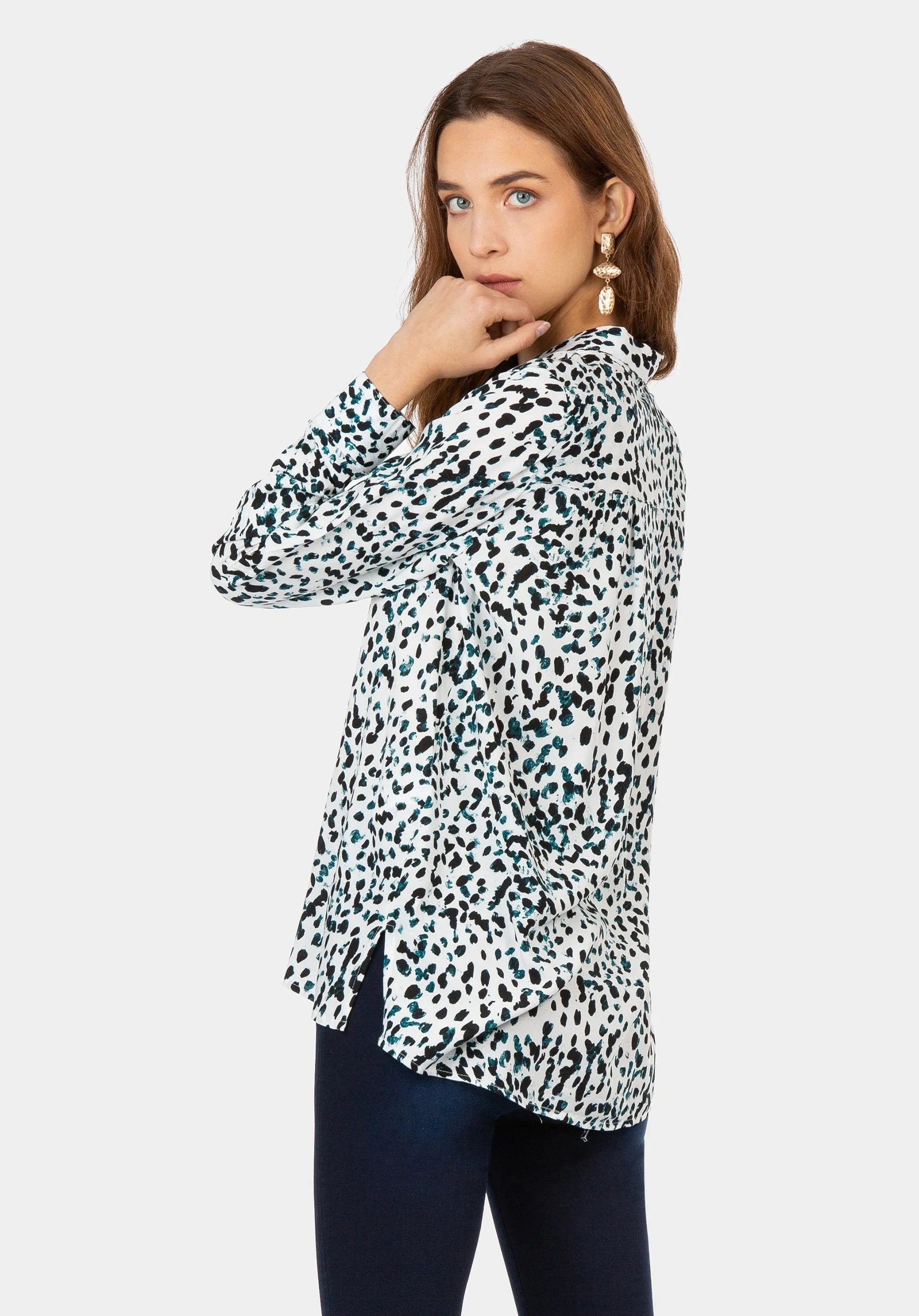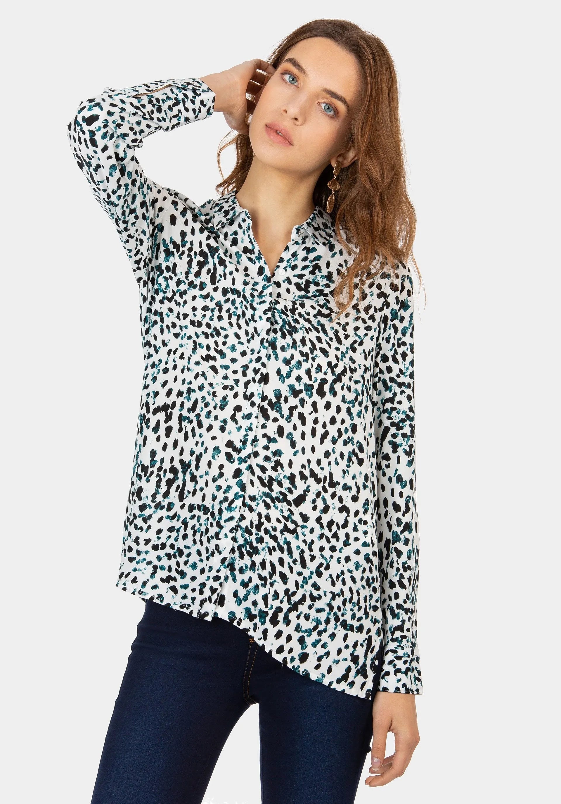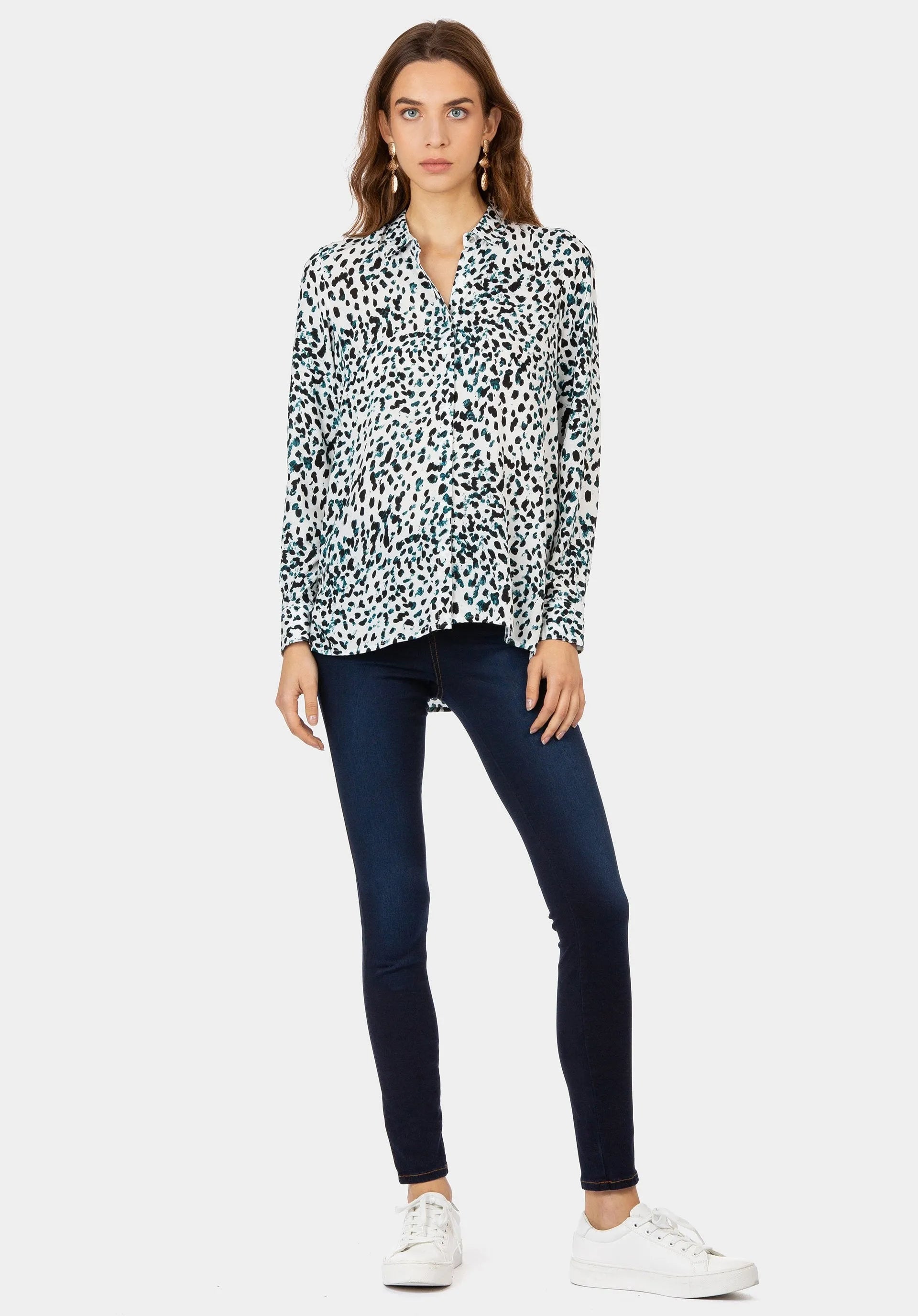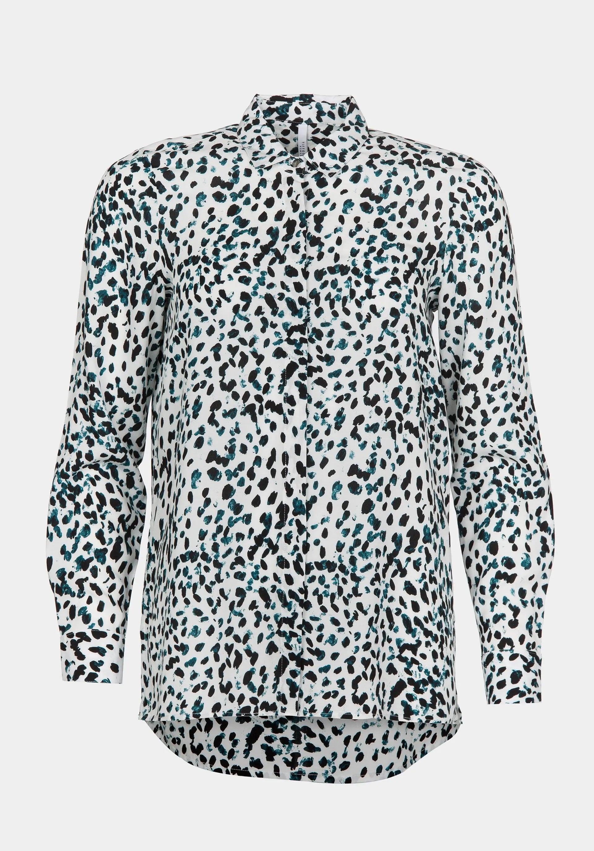 Camisa blanca estampada con manchas negras y azules.