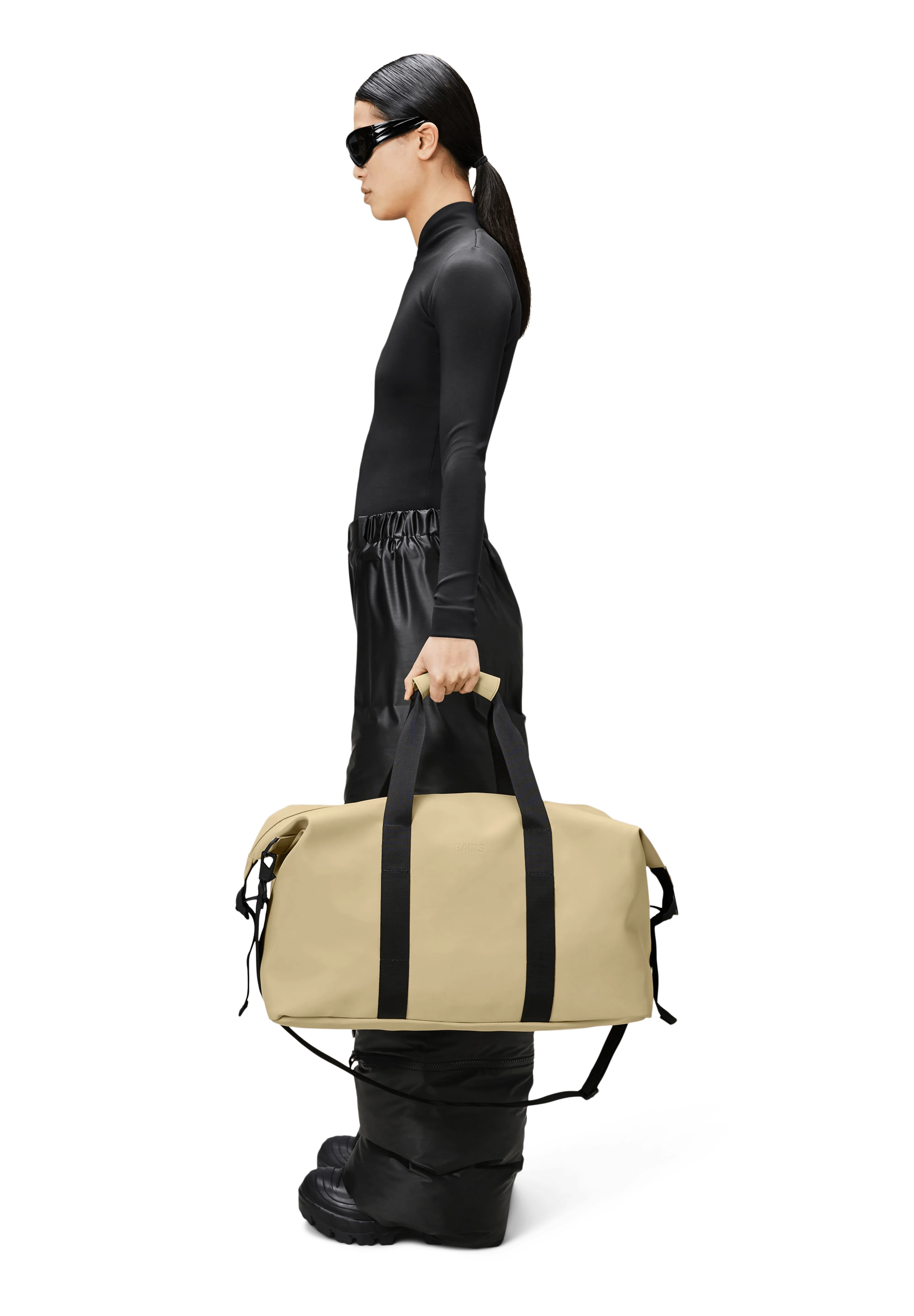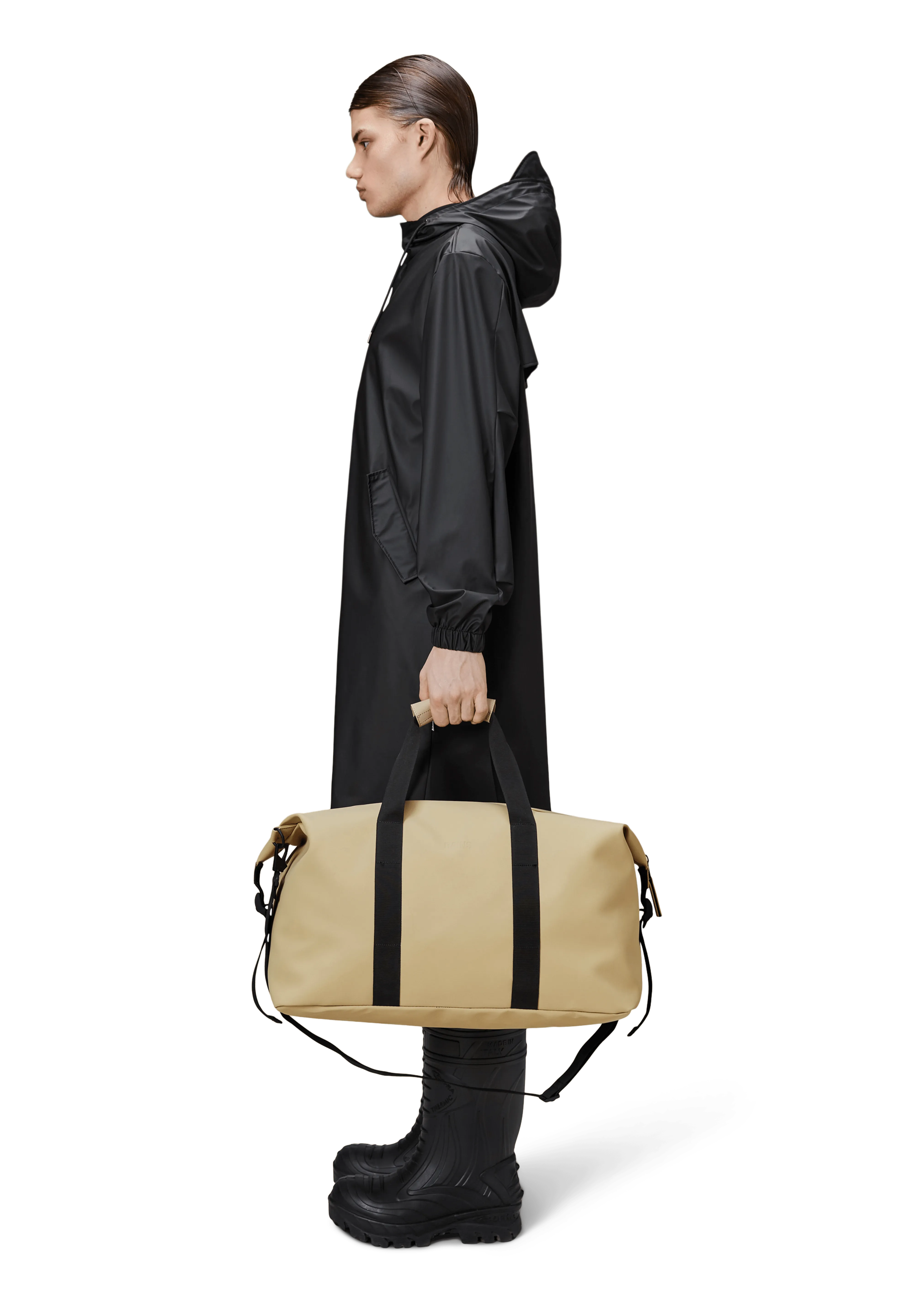 Hilo Weekend Bag, confeccionada con el tejido de poliuretano impermeable característico de Rains, ofrece durabilidad, resistencia al transporte y un suave acabado.
