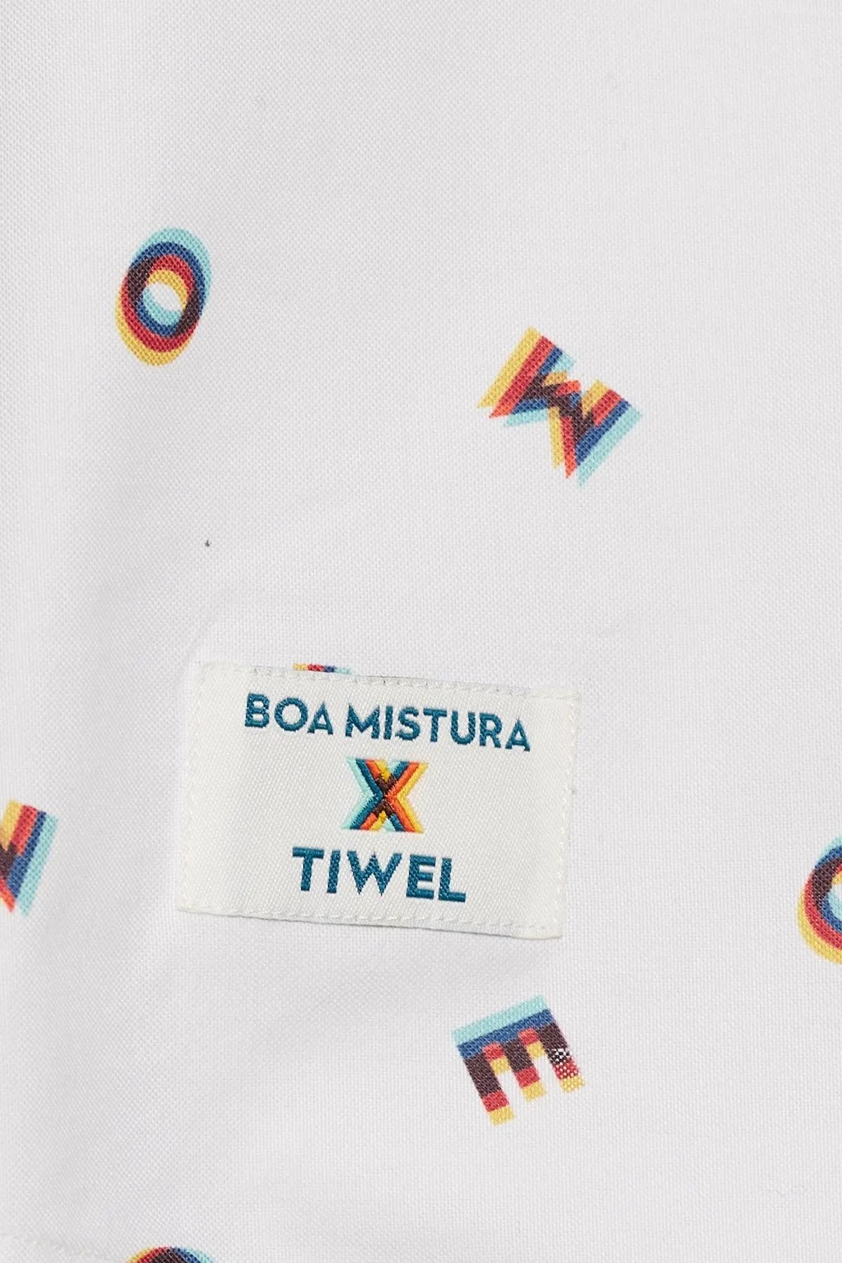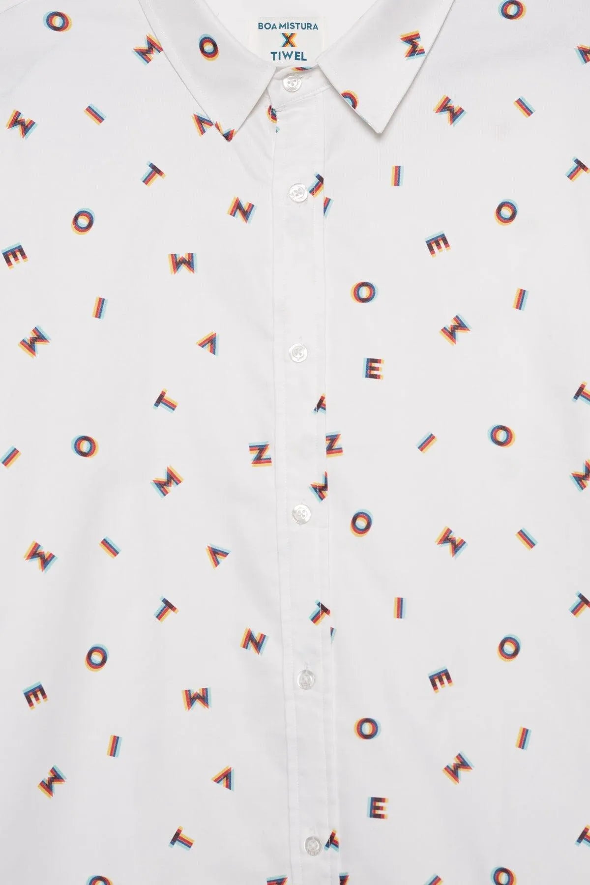 Camisa Movimiento con dibujo y decoración all-over-print con las letras de la palabra “Movimiento“. Diseñada, en exclusiva y edición limitada, para la nueva cápsula temática de Boa Mistura. Botones frontales a juego, logo en la solapa interior inferior, etiquetas decorativas en la parte inferior derecha, lavado estilo suave y regular fitting.