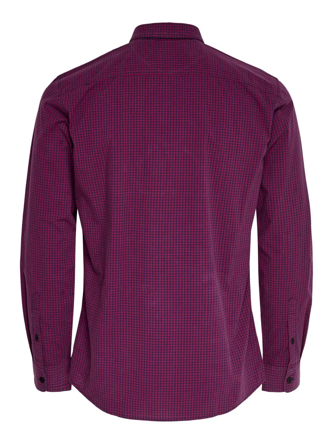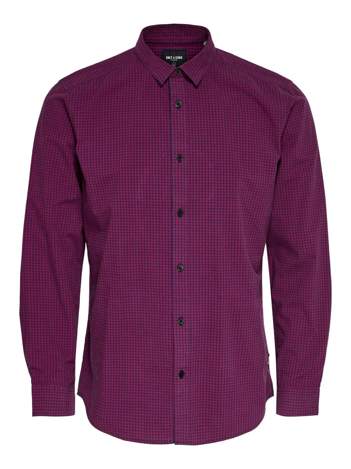 Camisa manga larga de cuadros tipo vichy con botones en el cuello y sin bolsillo.