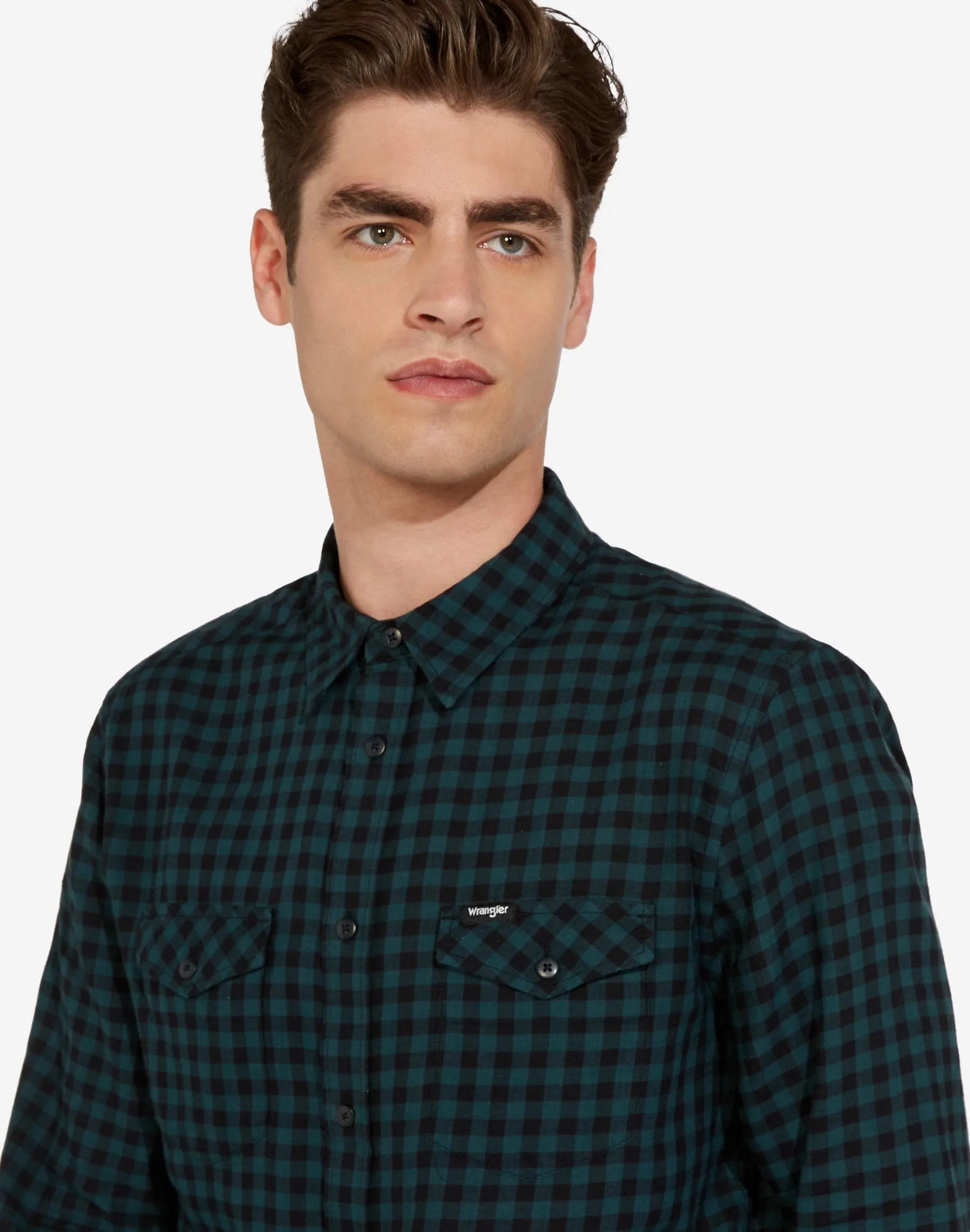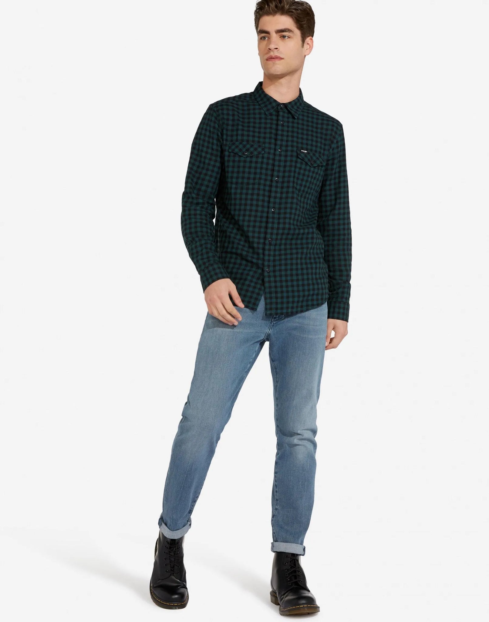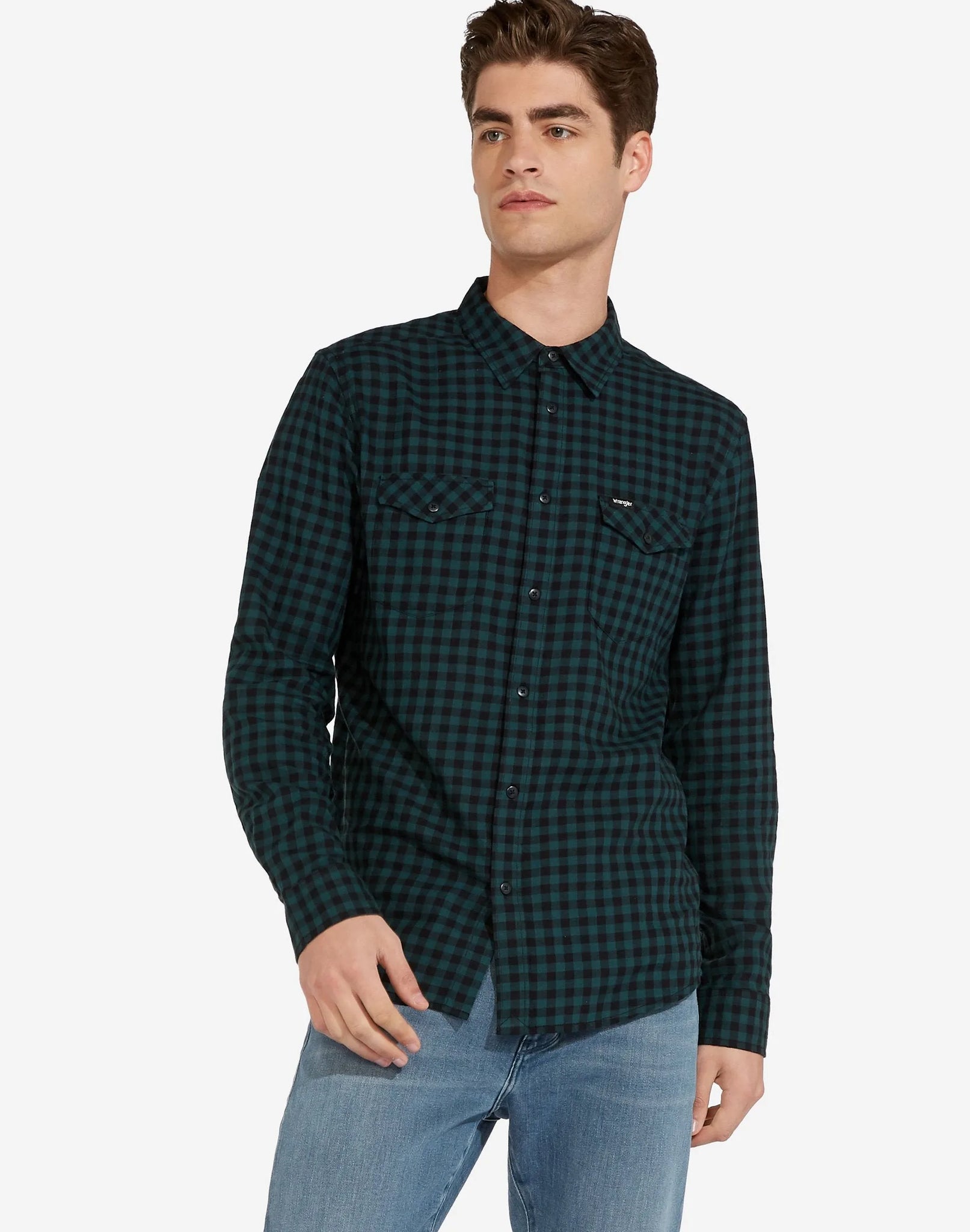 Un verdadero elemento básico del estilo Wrangler que nunca pasa de moda, la nueva camisa de dos bolsillos de esta temporada viene estampada con un estampado de cuadros verde bosque y negro. Moda casual elegante en su máxima expresión.