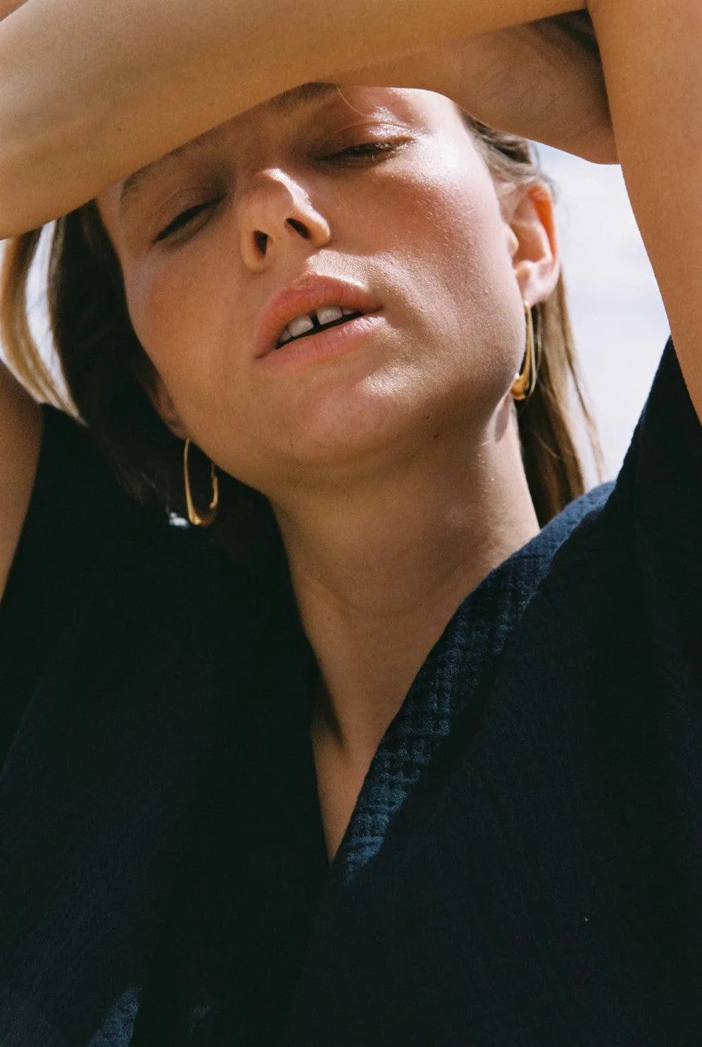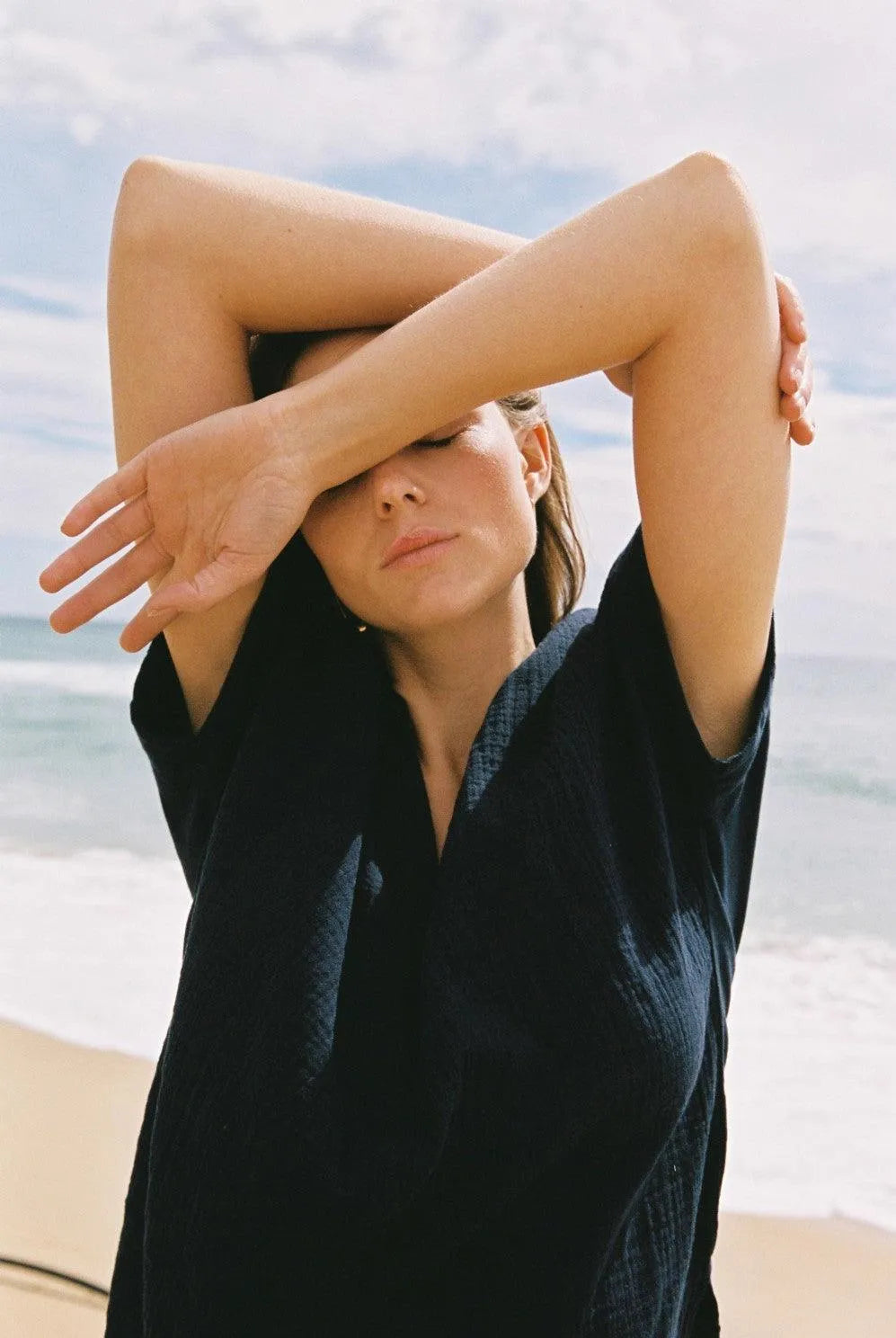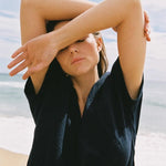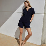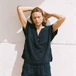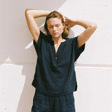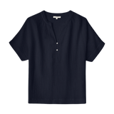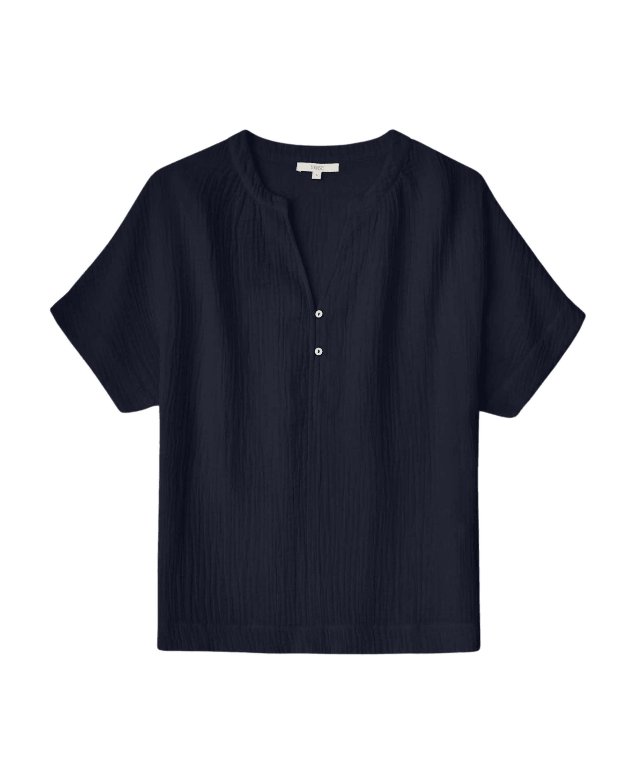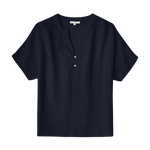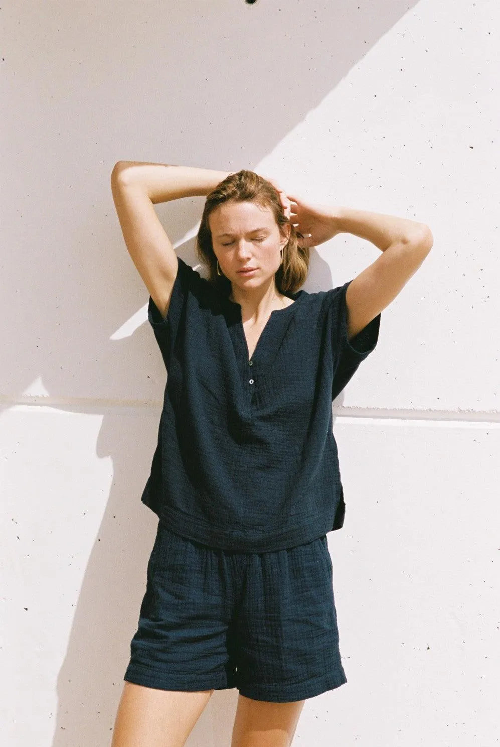 Camisa 100% algodón. Tejido de bambula. Cuello mao con escote de pico. Detalle de botones. Manga corta. Fitting recto. Composición: 100% algodón. Altura modelo 175 cm, talla S.