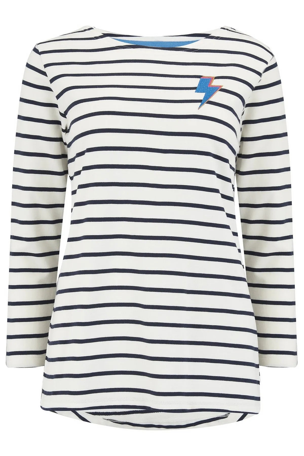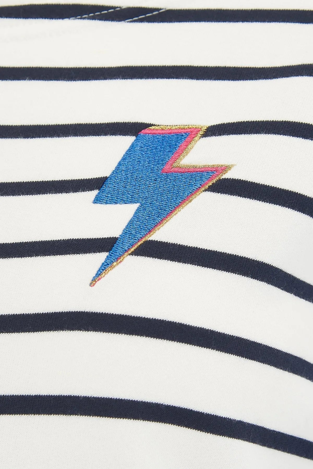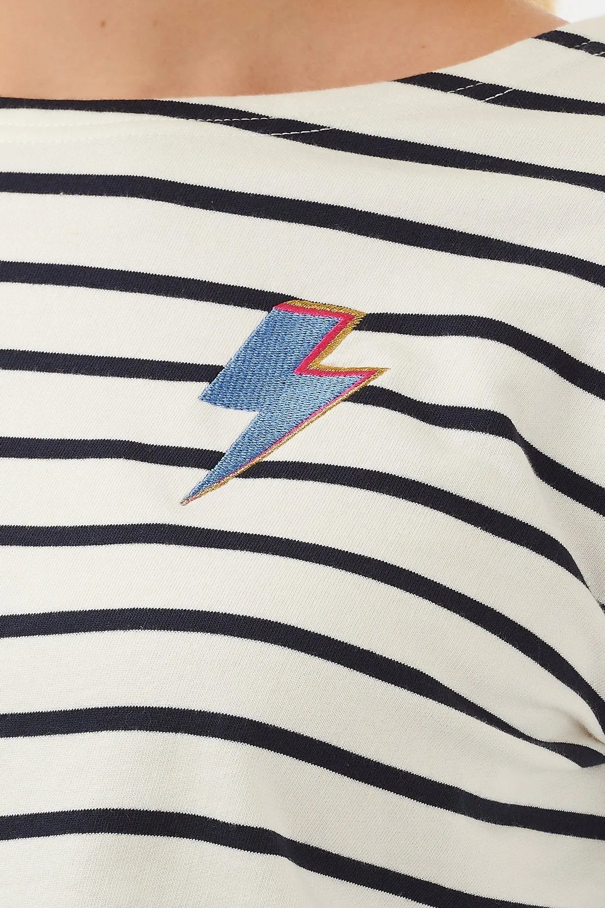 Confeccionada con un suave algodón 100% orgánico, la camiseta Brighton Thunderstruck combina nuestra forma Brighton más vendida con un bot de relámpago de rock n 'roll en una clásica raya azul marino.