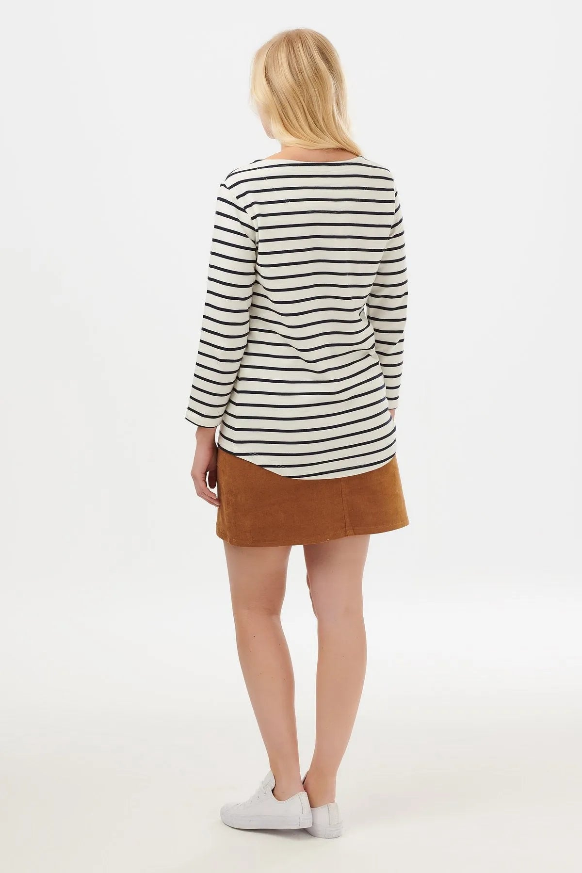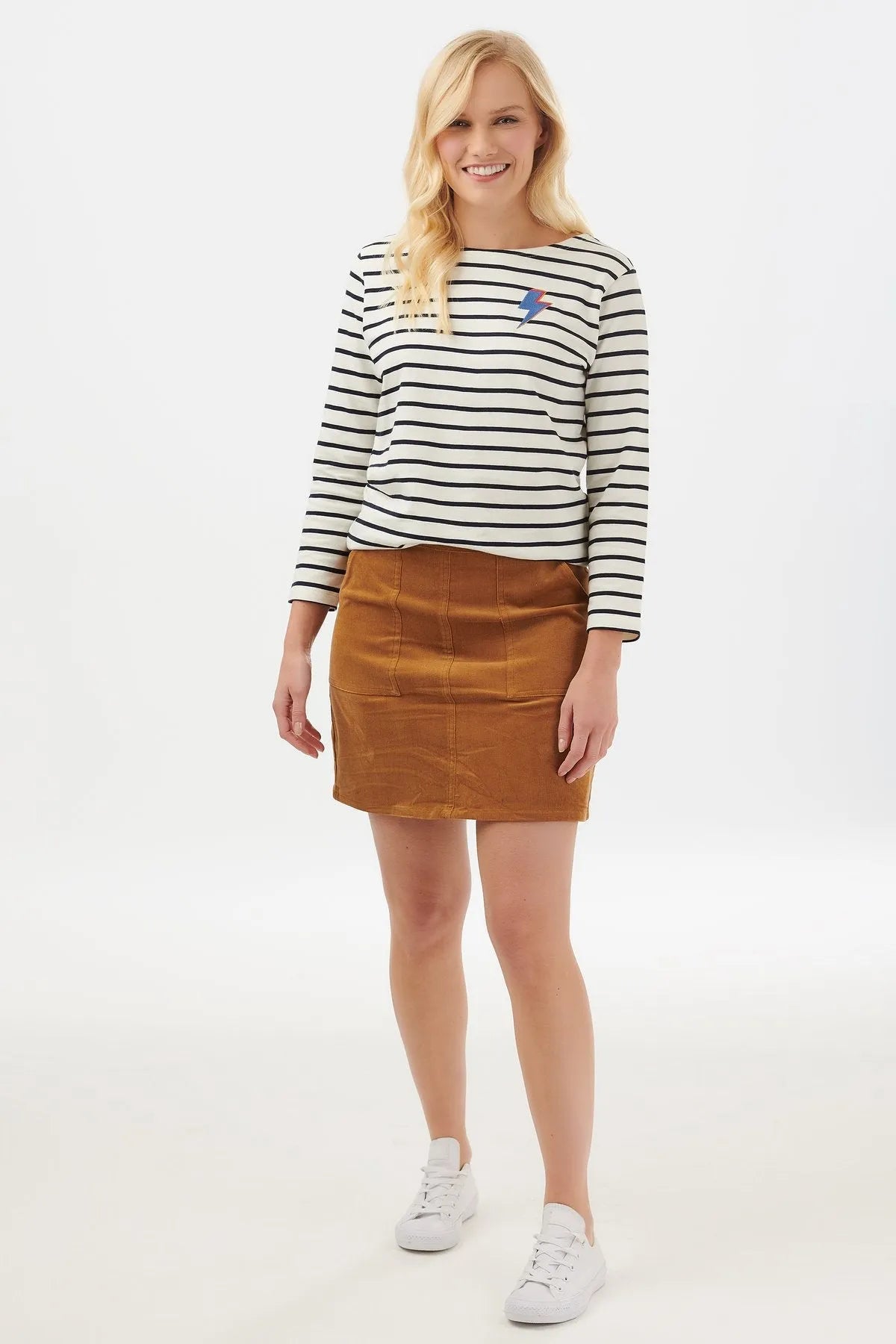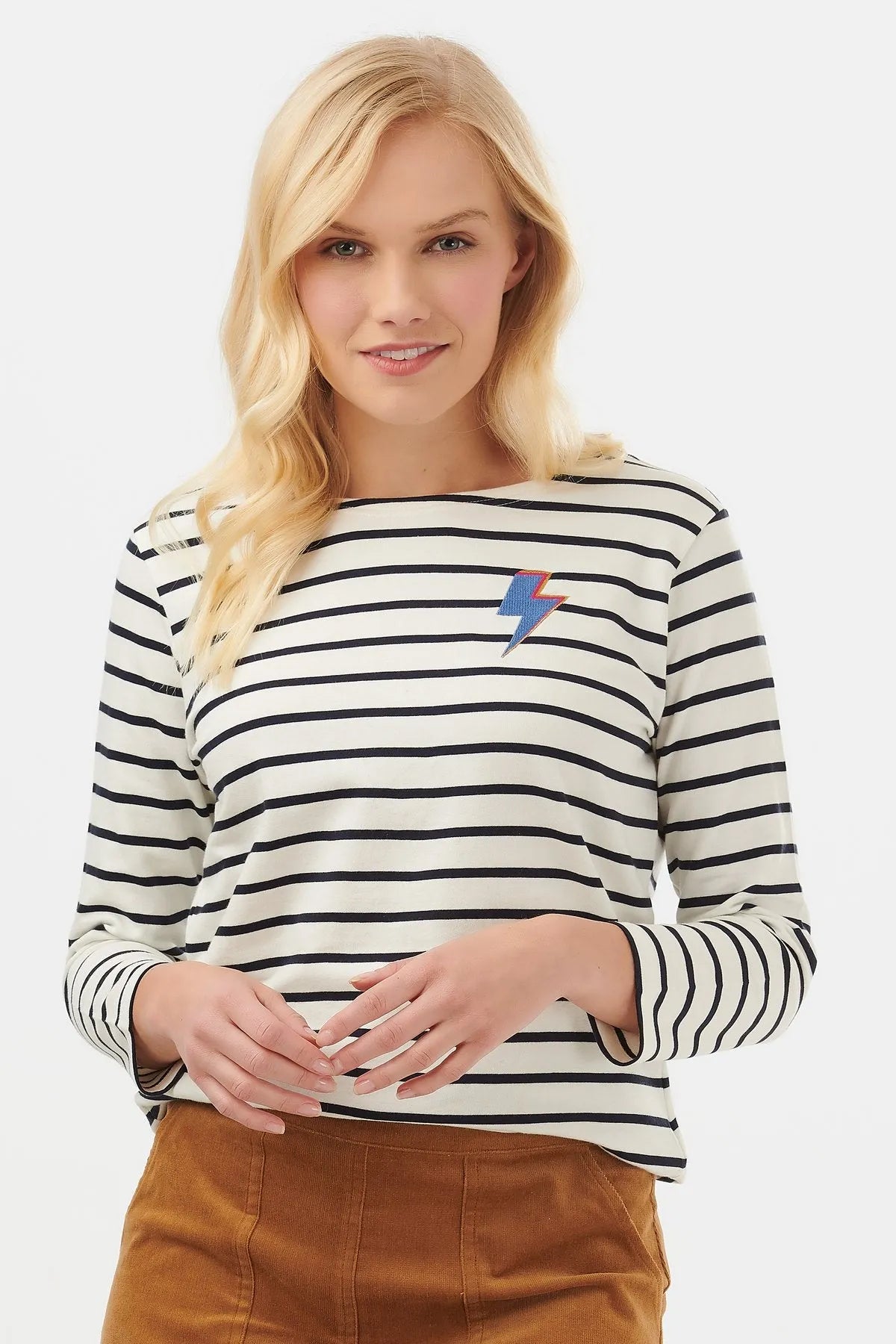 Confeccionada con un suave algodón 100% orgánico, la camiseta Brighton Thunderstruck combina nuestra forma Brighton más vendida con un bot de relámpago de rock n 'roll en una clásica raya azul marino.