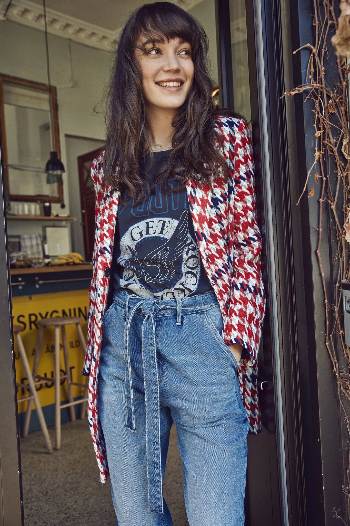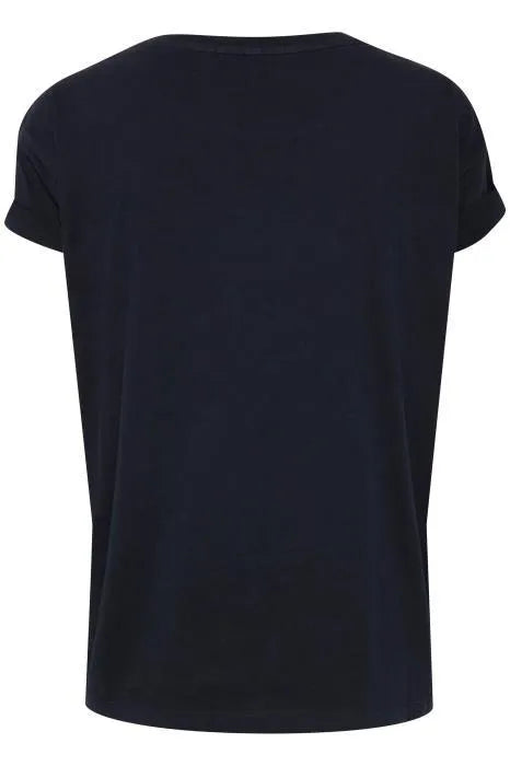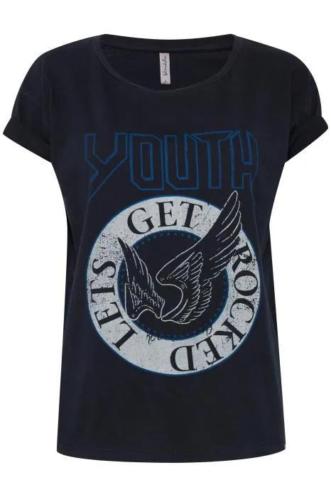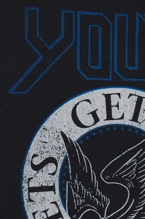 Camiseta de manga corta negra lavada con estampado tipo "rockero" en el pecho.
