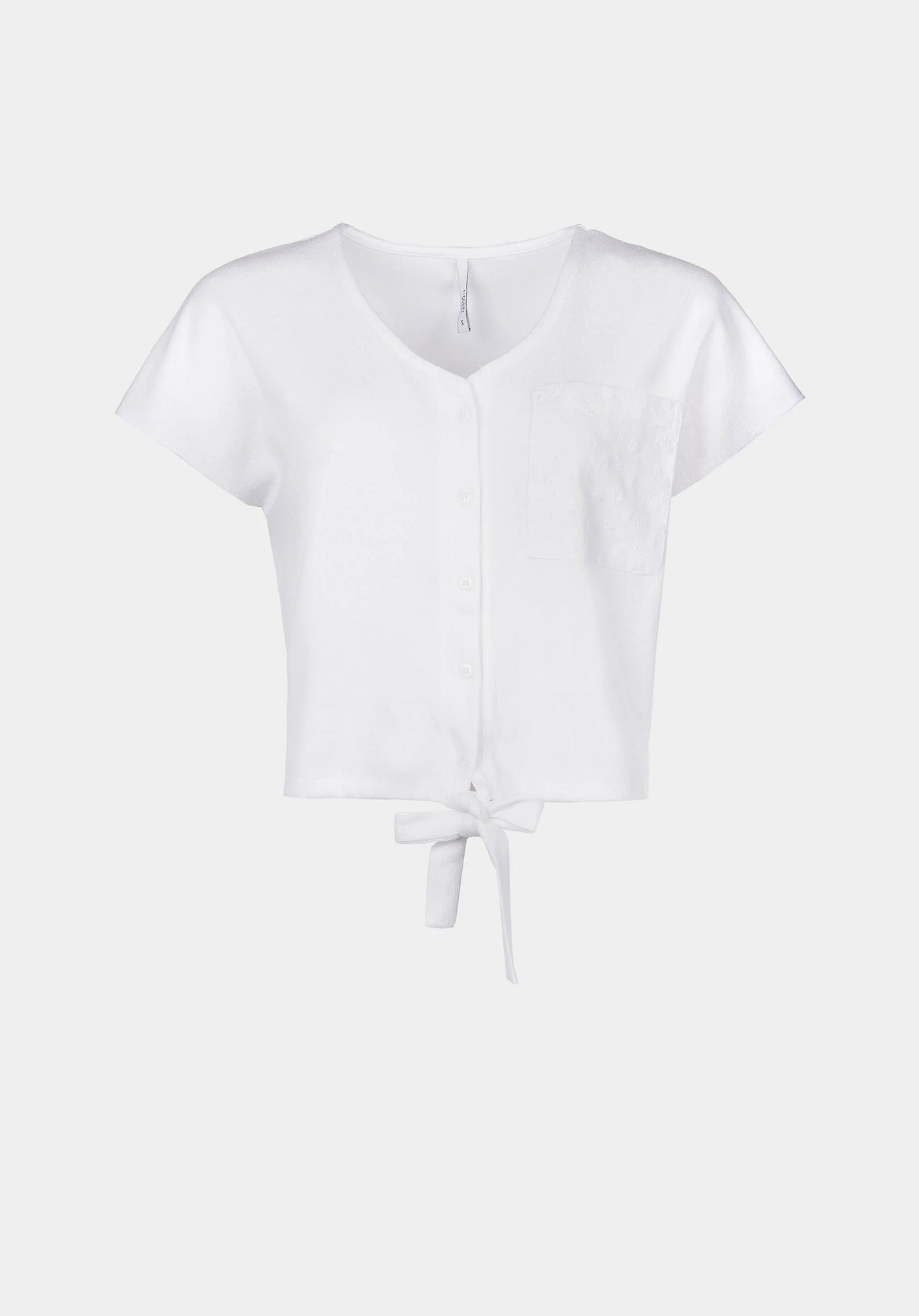 Camiseta de escote pico y manga corta. Bolsillo delantero en bordado inglés. Cierre frontal con botones. Detalle de lazo.