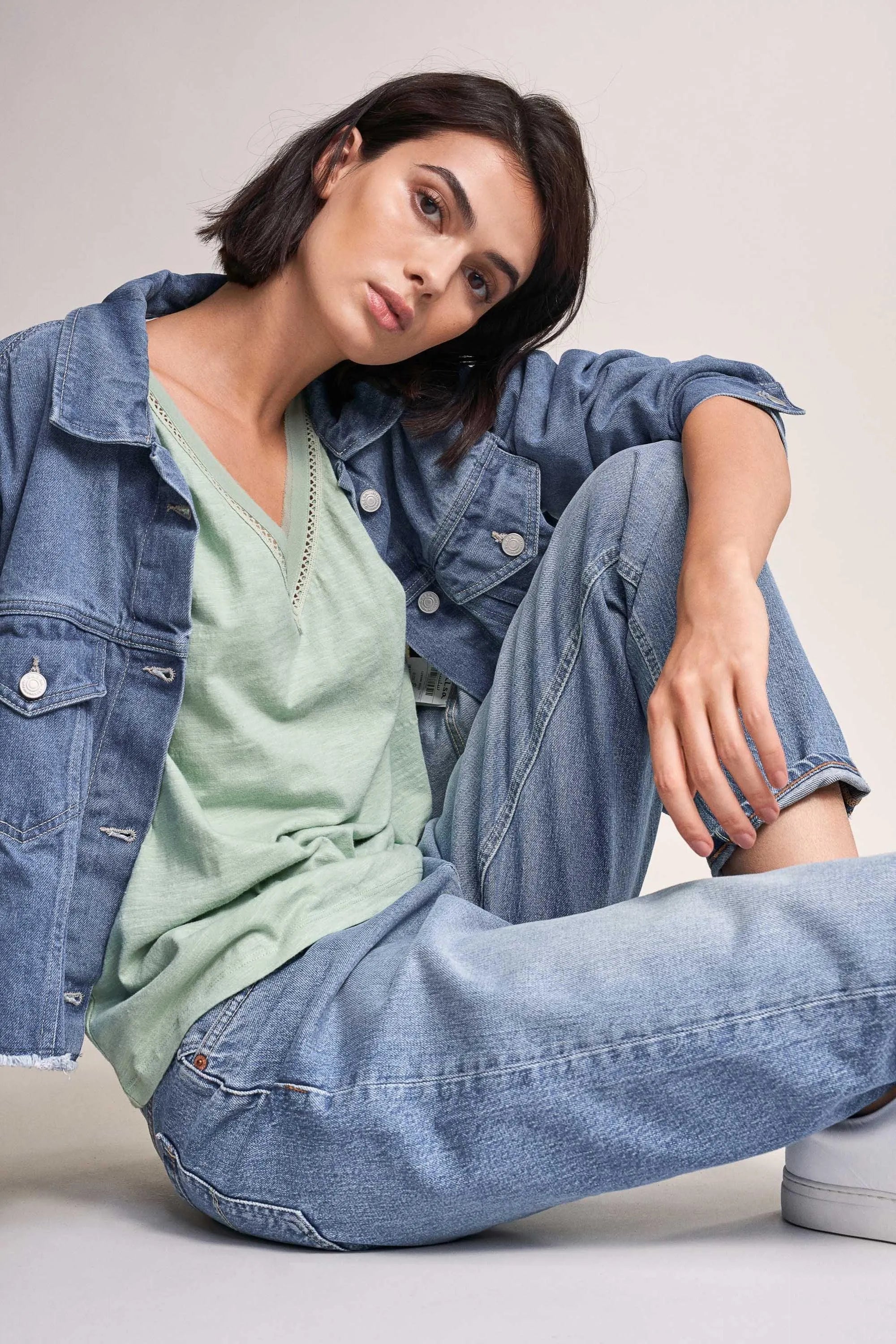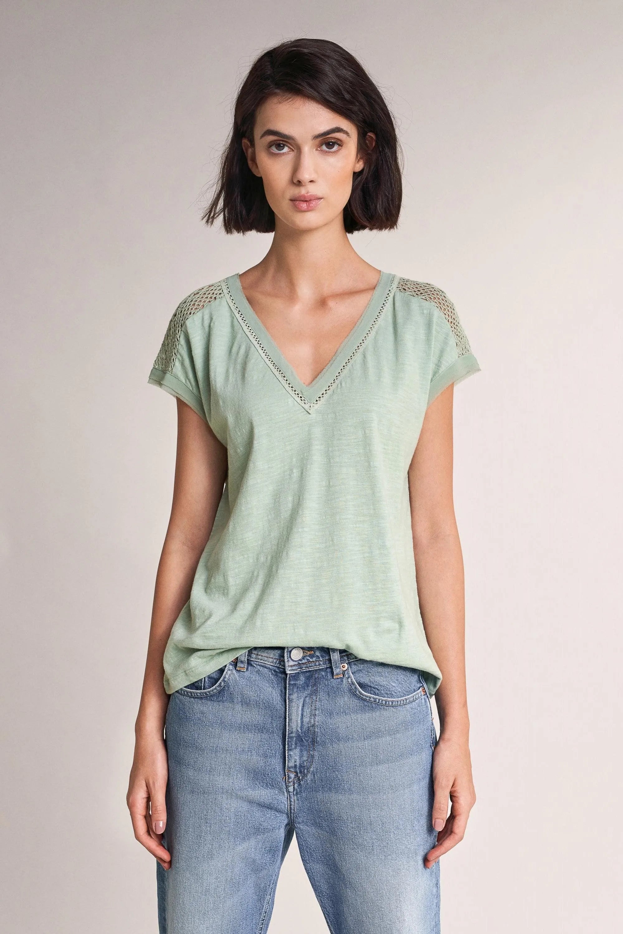 Camiseta de cuello pico con encaje en los hombros.