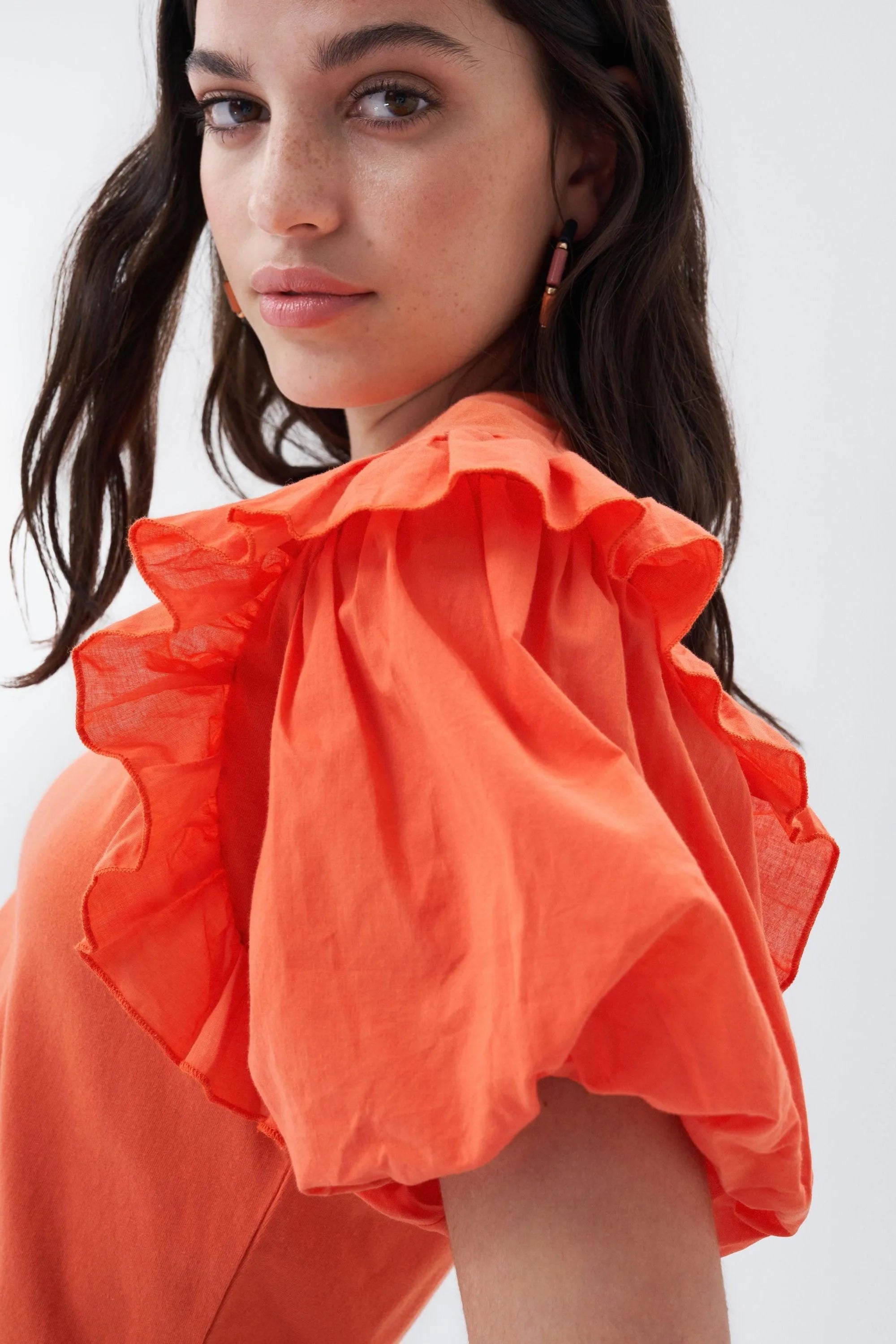 Camiseta con manga farol y detalle plisado. Corte Regular. Escote de pico. Manga corta farol de tejido y volante plisado de tejido. Punto de algodón. Color blanco liso.
