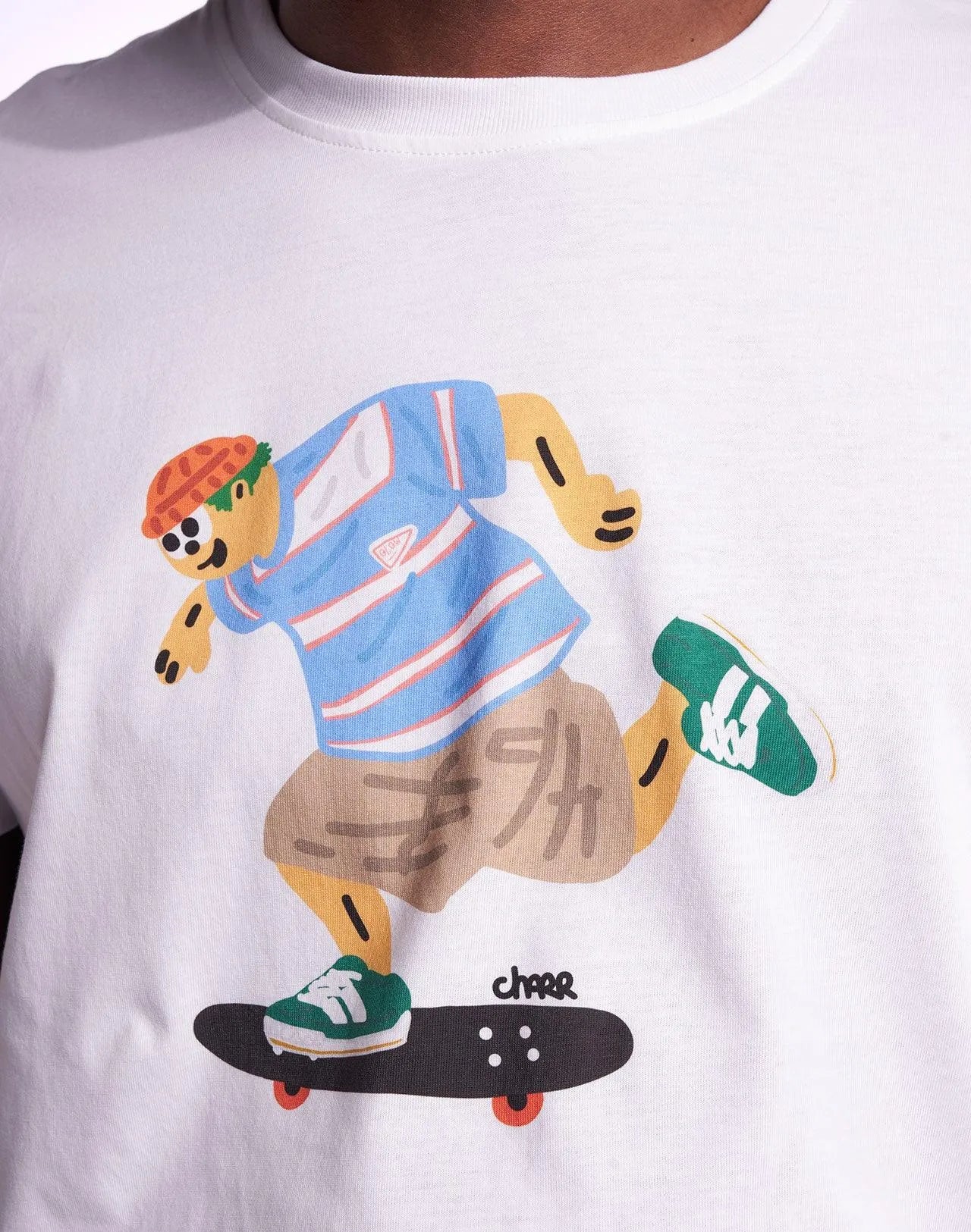 Camiseta de cuello redondo color hueso con impresión digital centrada por el artista Charr.