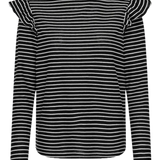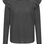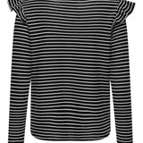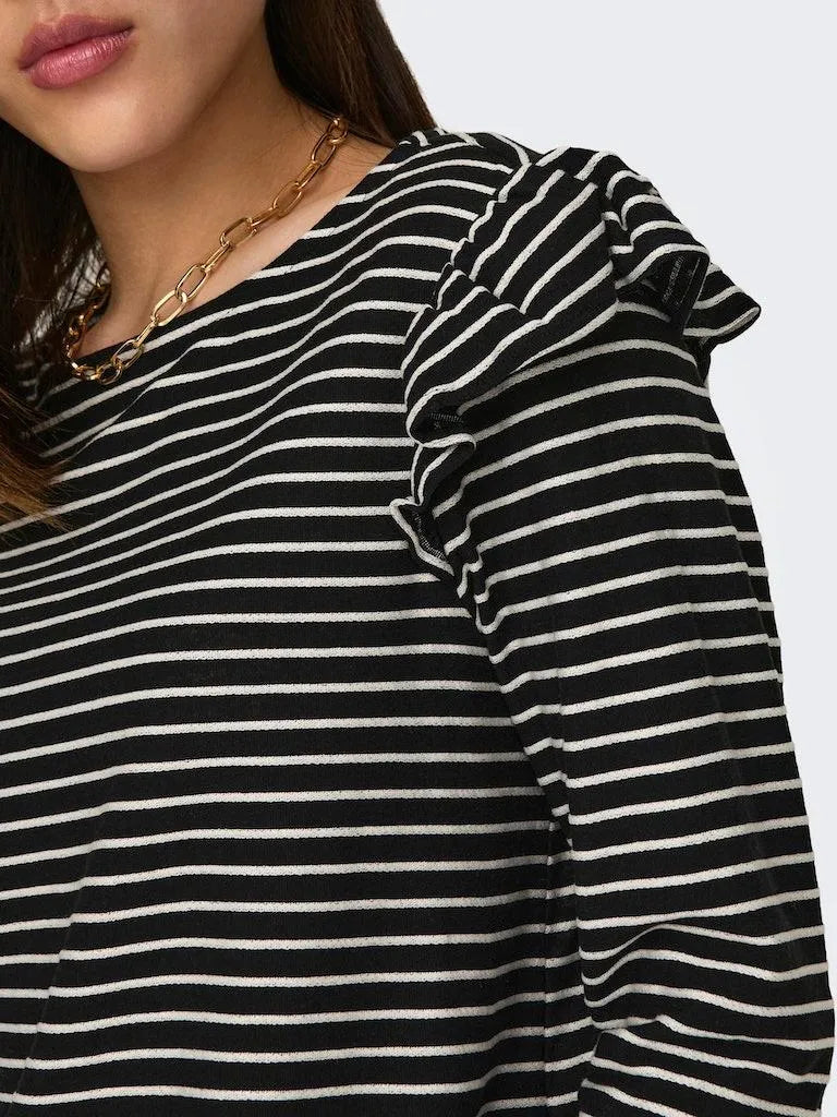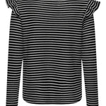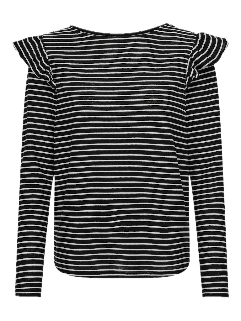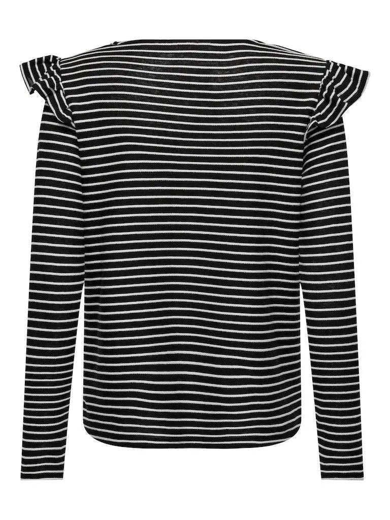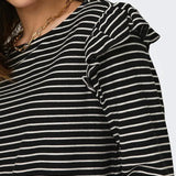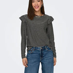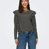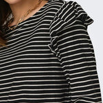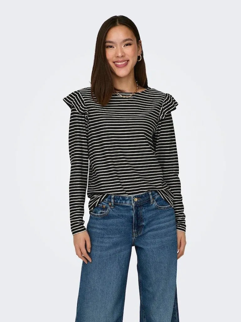 Camiseta ONLY de cuello redondo, con estampado a rayas blanco y negro y detalle de volantes en las mangas.