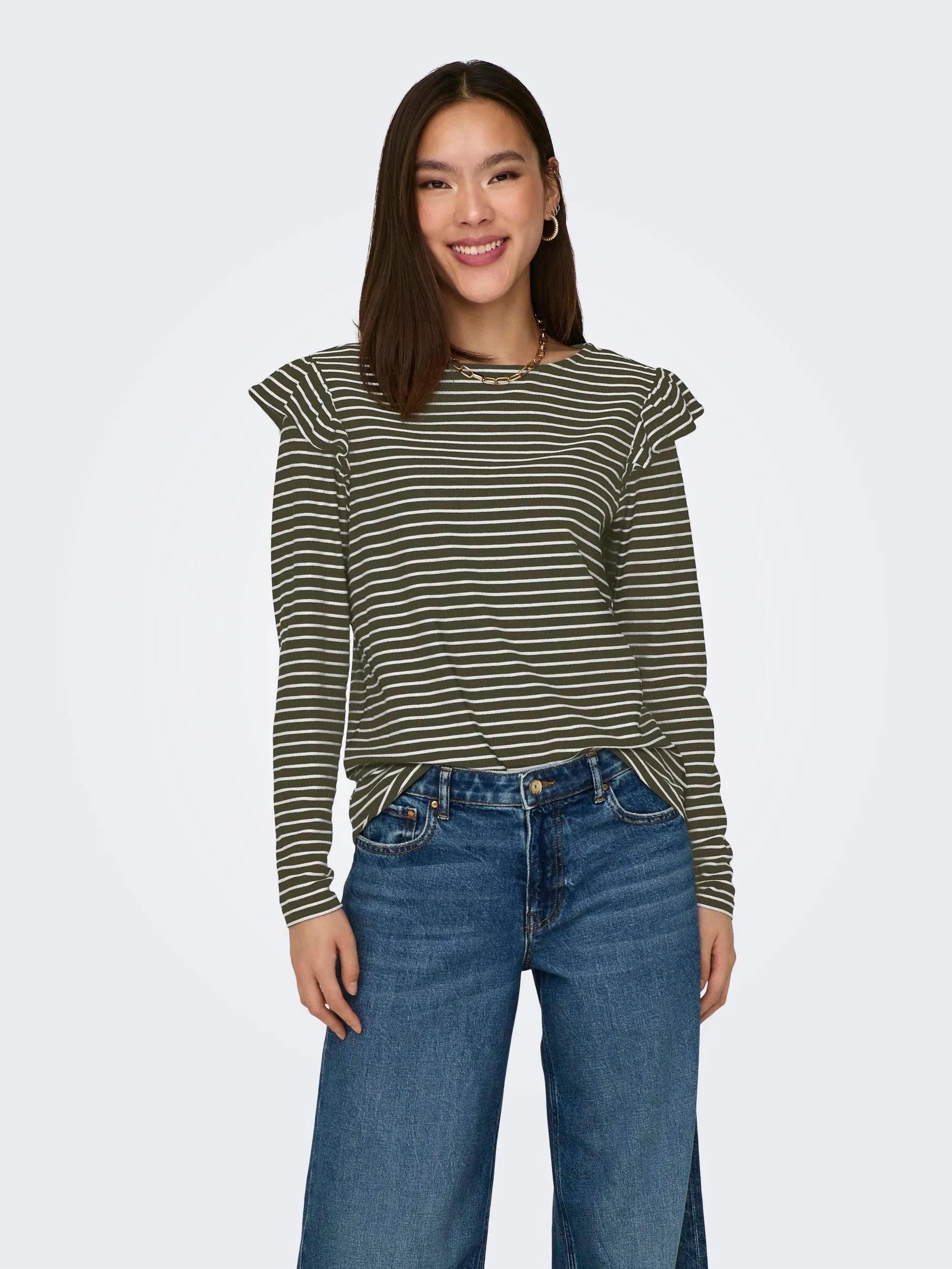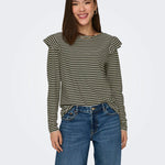 Camiseta ONLY de cuello redondo, con estampado a rayas blanco y negro y detalle de volantes en las mangas.