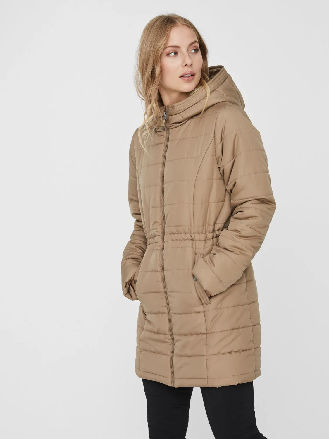 Chaqueta de edredón con capucha y cierre de cremallera, bolsillos abiertos y cordones ocultos en la cintura. Use la chaqueta con botas gruesas en el invierno.