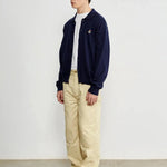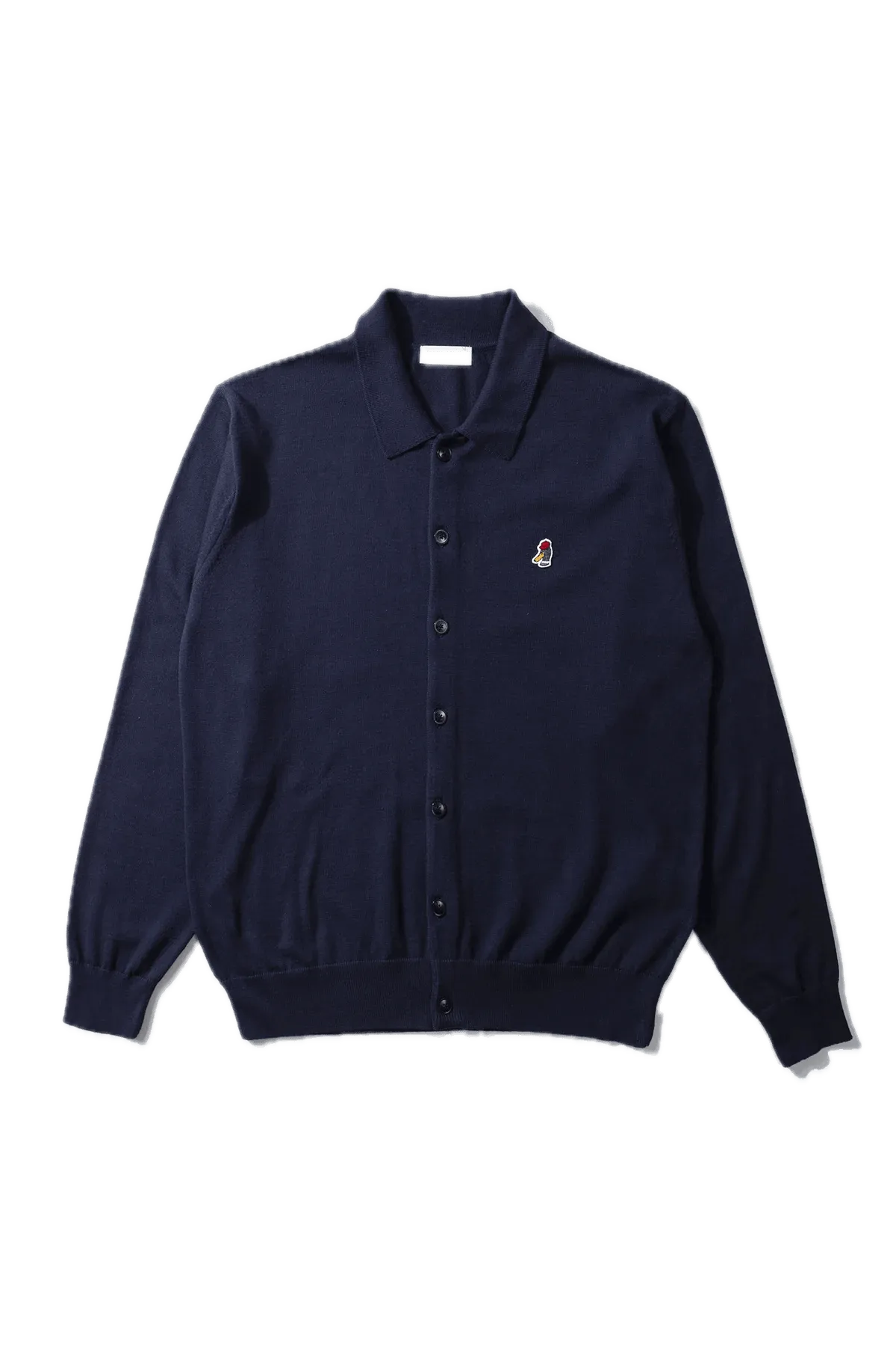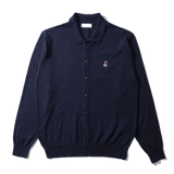 Cárdigan de punto azul hecha de algodón 100%. Tiene cuello de camisa y se completa con cierre de botones. Con nuestro icónico pato en el pecho.