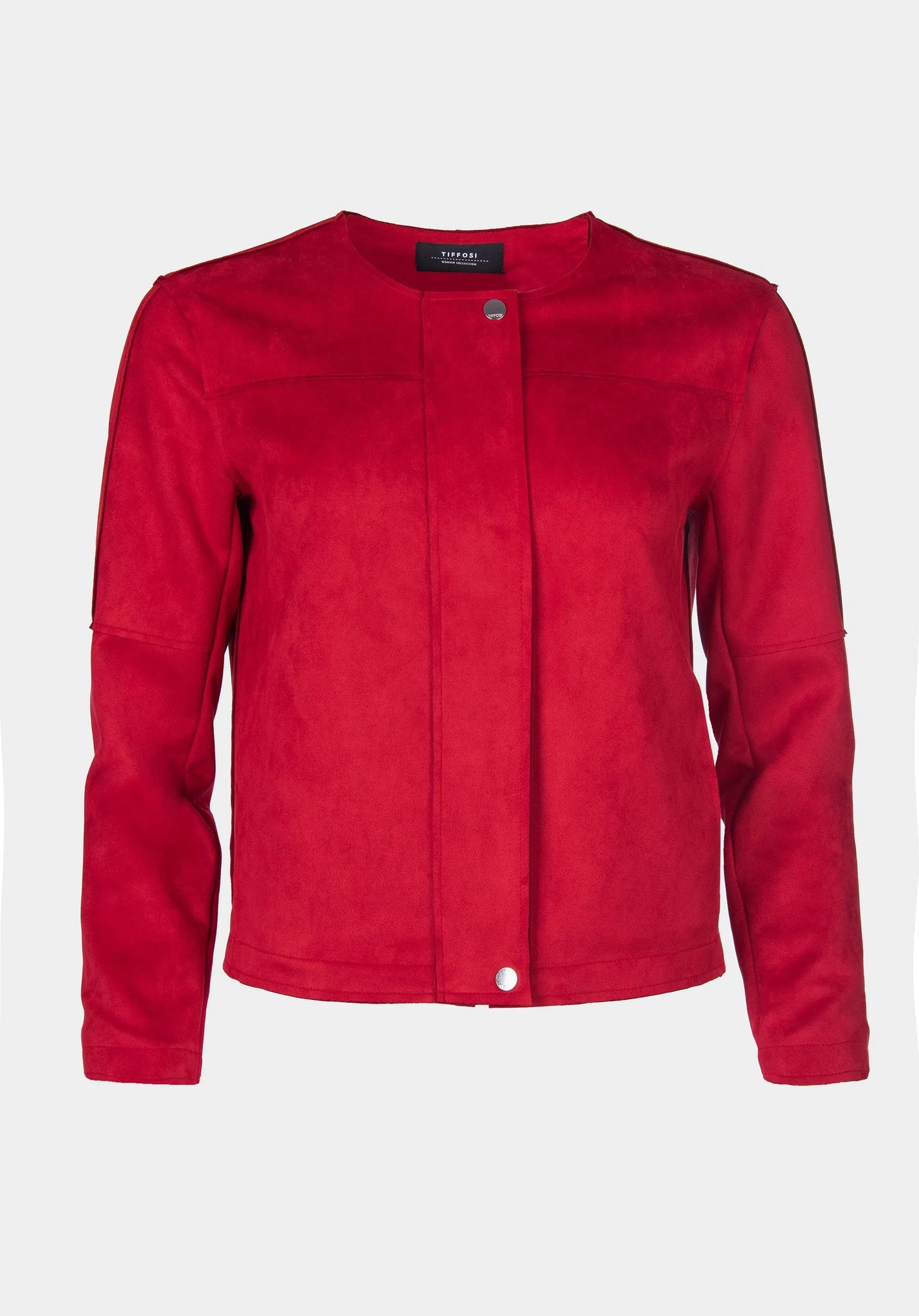 Chaqueta de ante, cuello redondo y manga larga. Cierre frontal con cremallera oculta por solapa y botones metálicos. Bolsillos laterales.