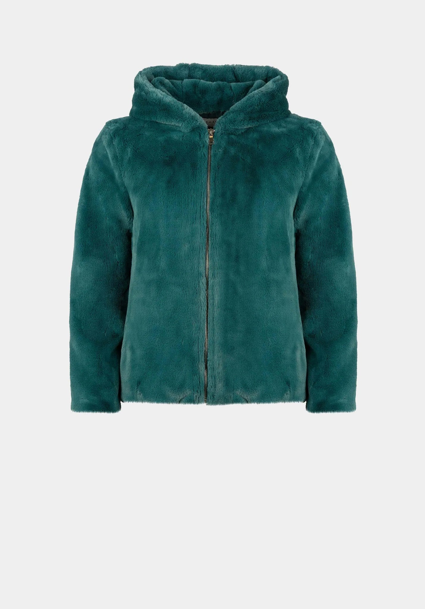 Chaqueta verde de pelo tipo "peluche" con gorro y cierre de cremallera.
