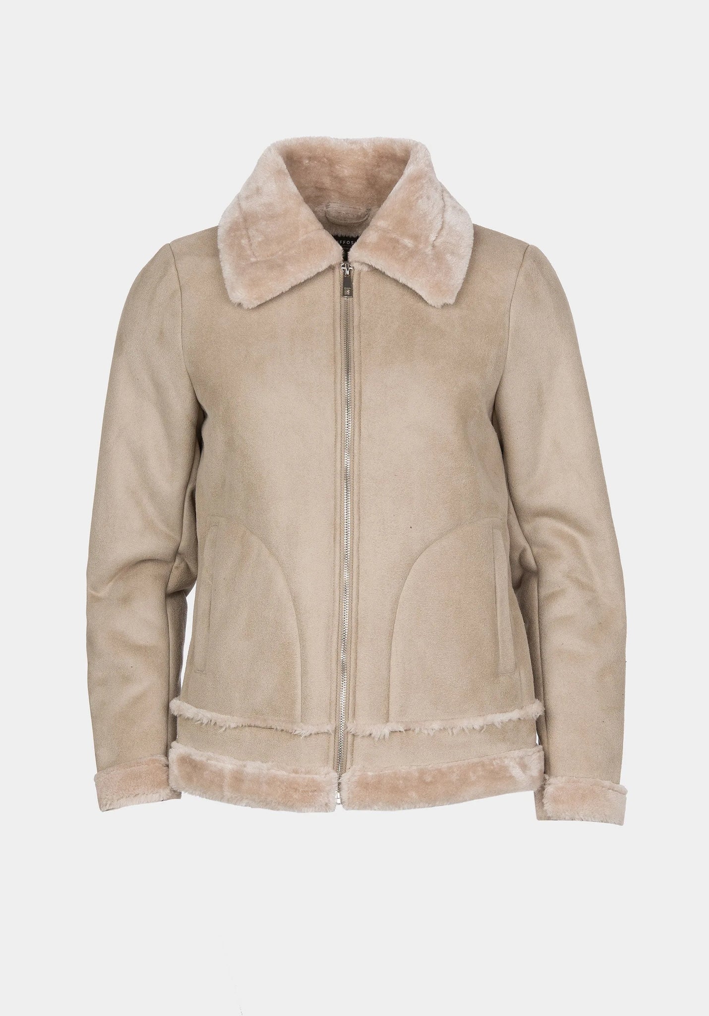 Cazadora de efecto polipiel con pelo artificial en el interior.