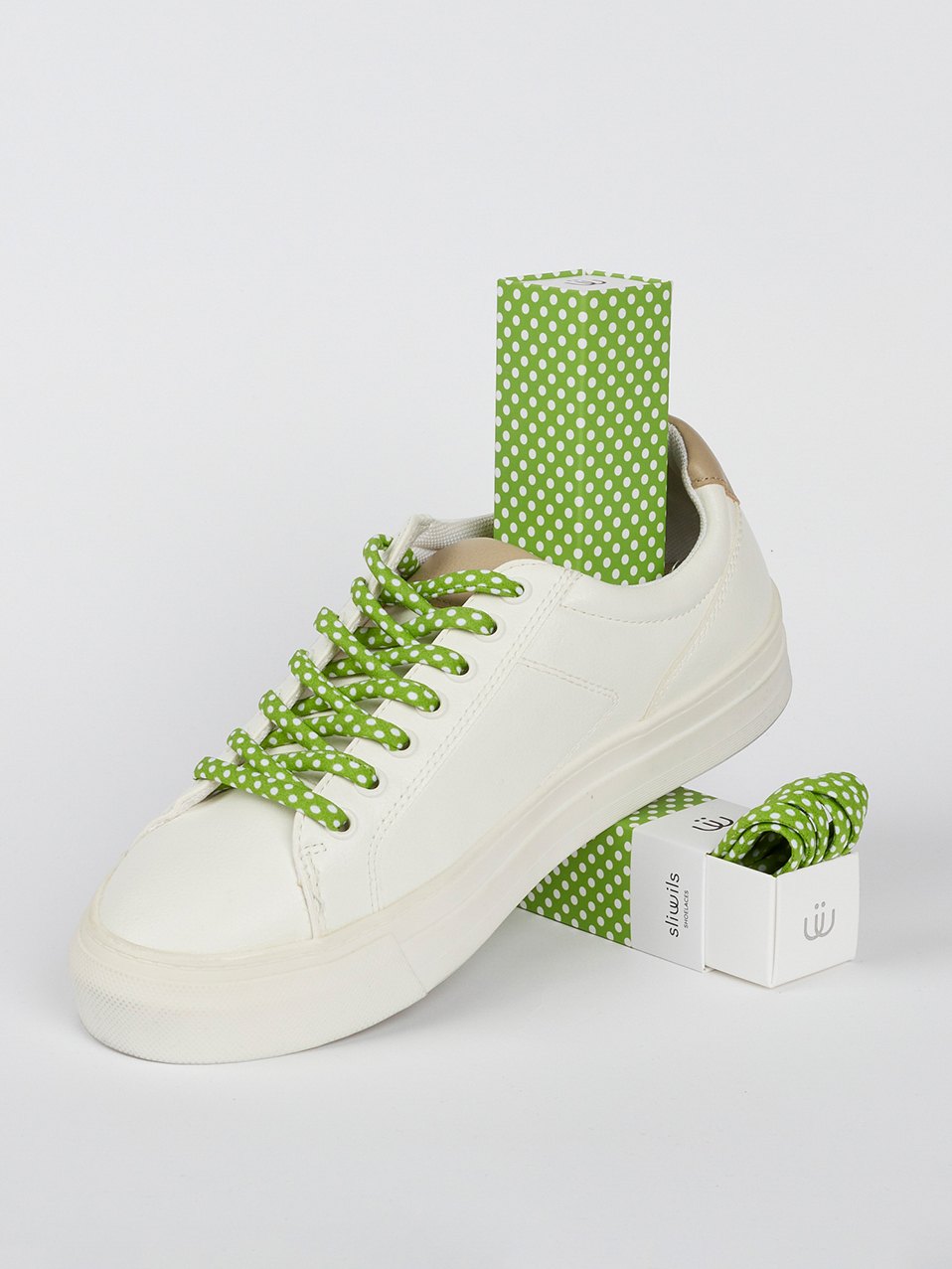 Cordones en fondo verde con estampado de lunares blancos que aportan un aire alegre y distintivo al calzado urbano. Fabricados en España con técnica al bies, combinan estilo, resistencia y un acabado auténtico para destacar en el uso diario.