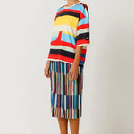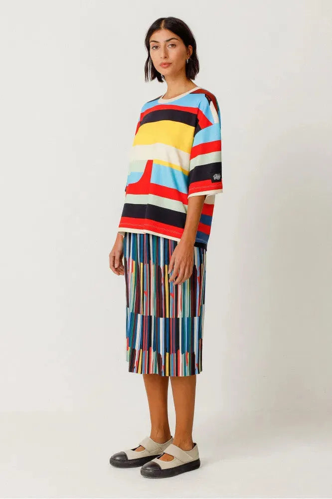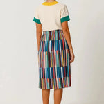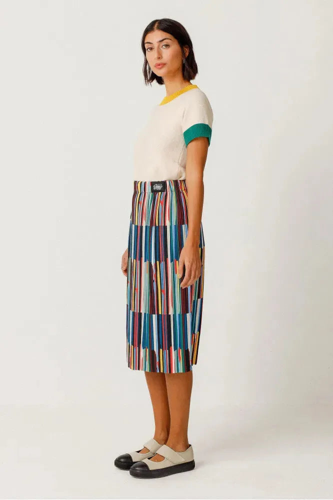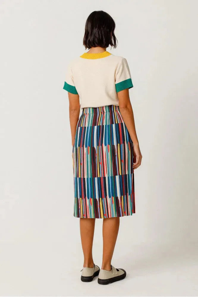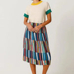 Falda midi acampanada con cintura elástica, de estilo fácil de poner y fino tejido plisado. Una opción cómoda y actual. Colaboración con Grems.