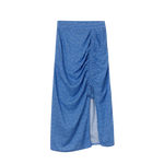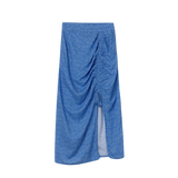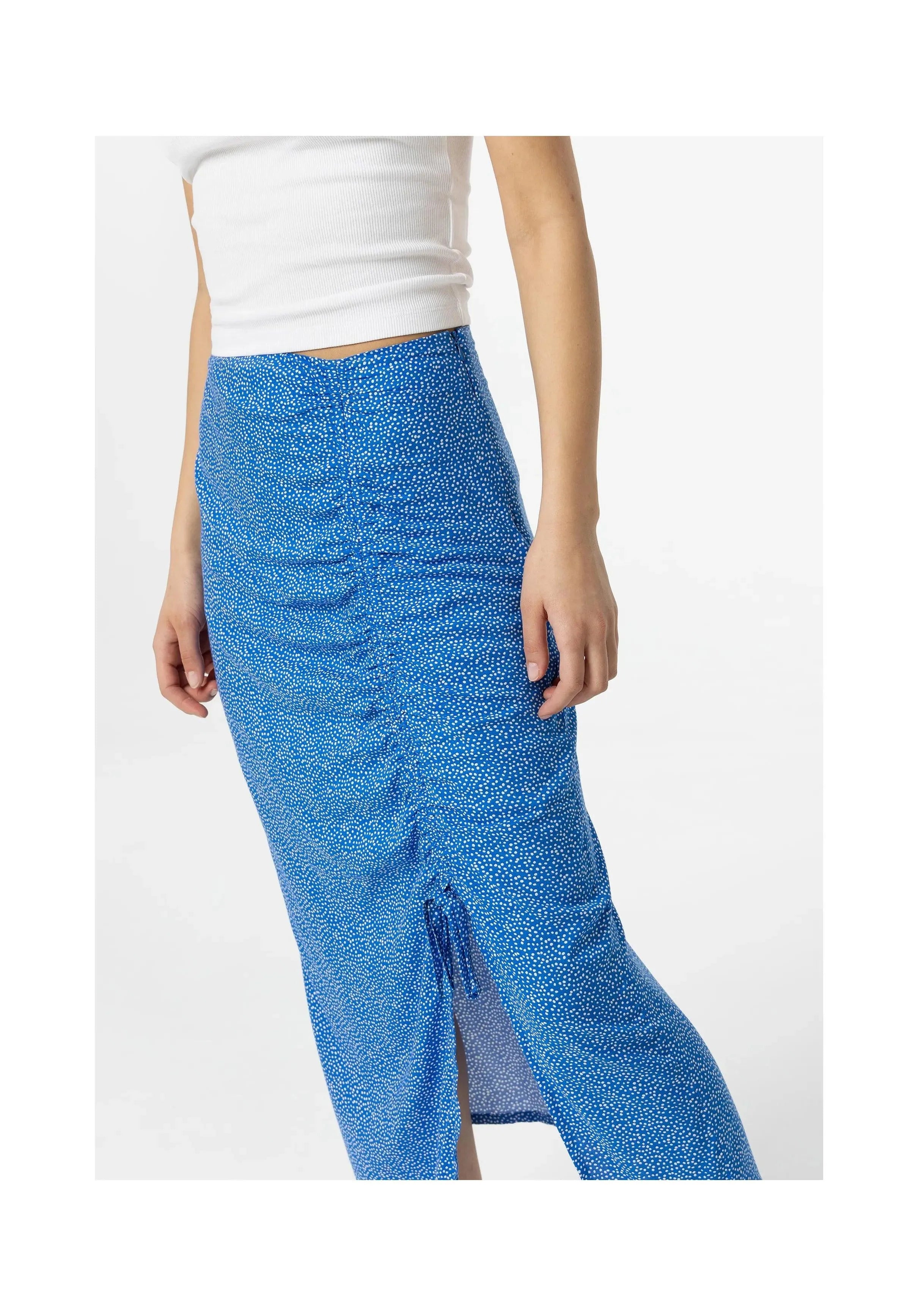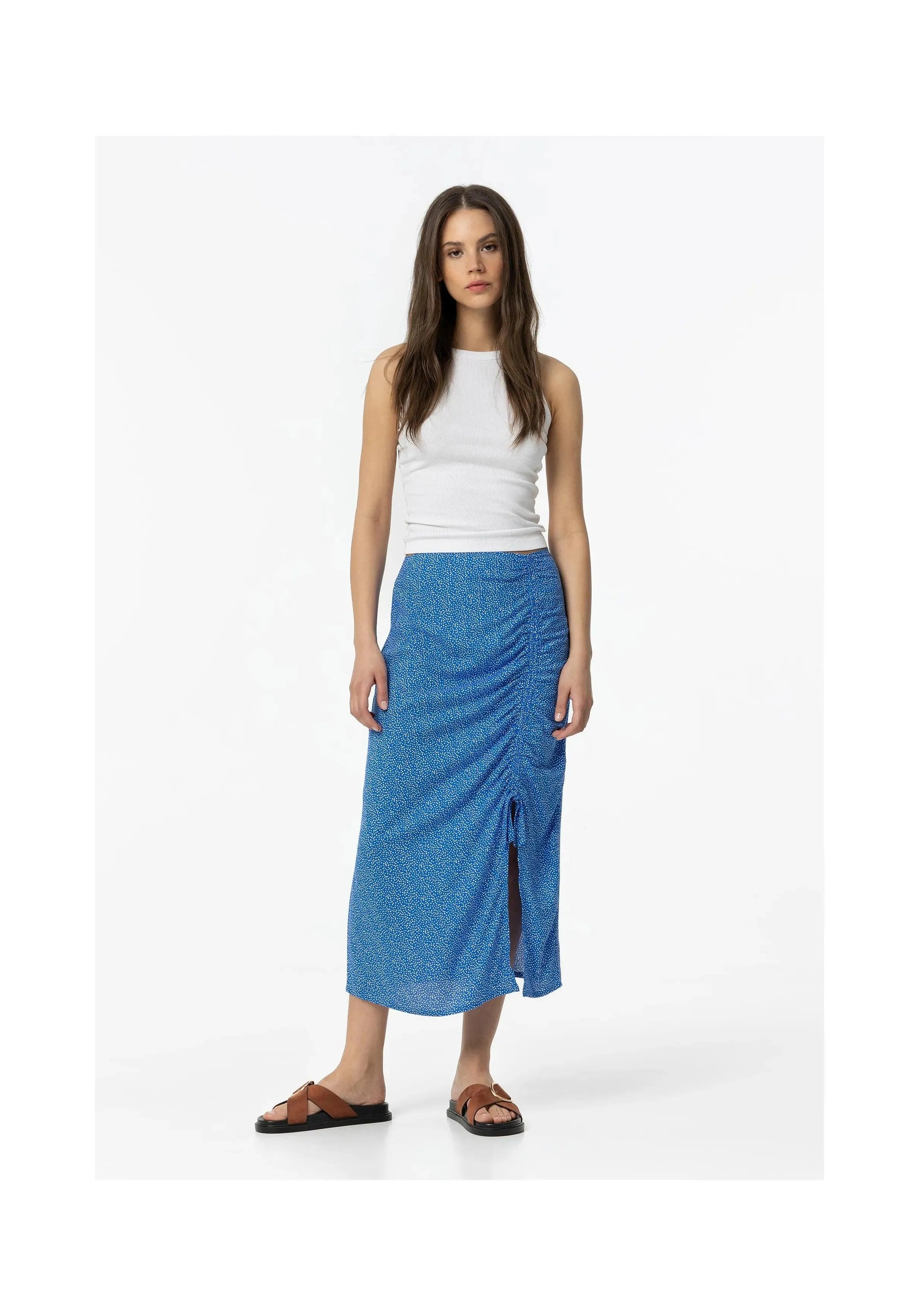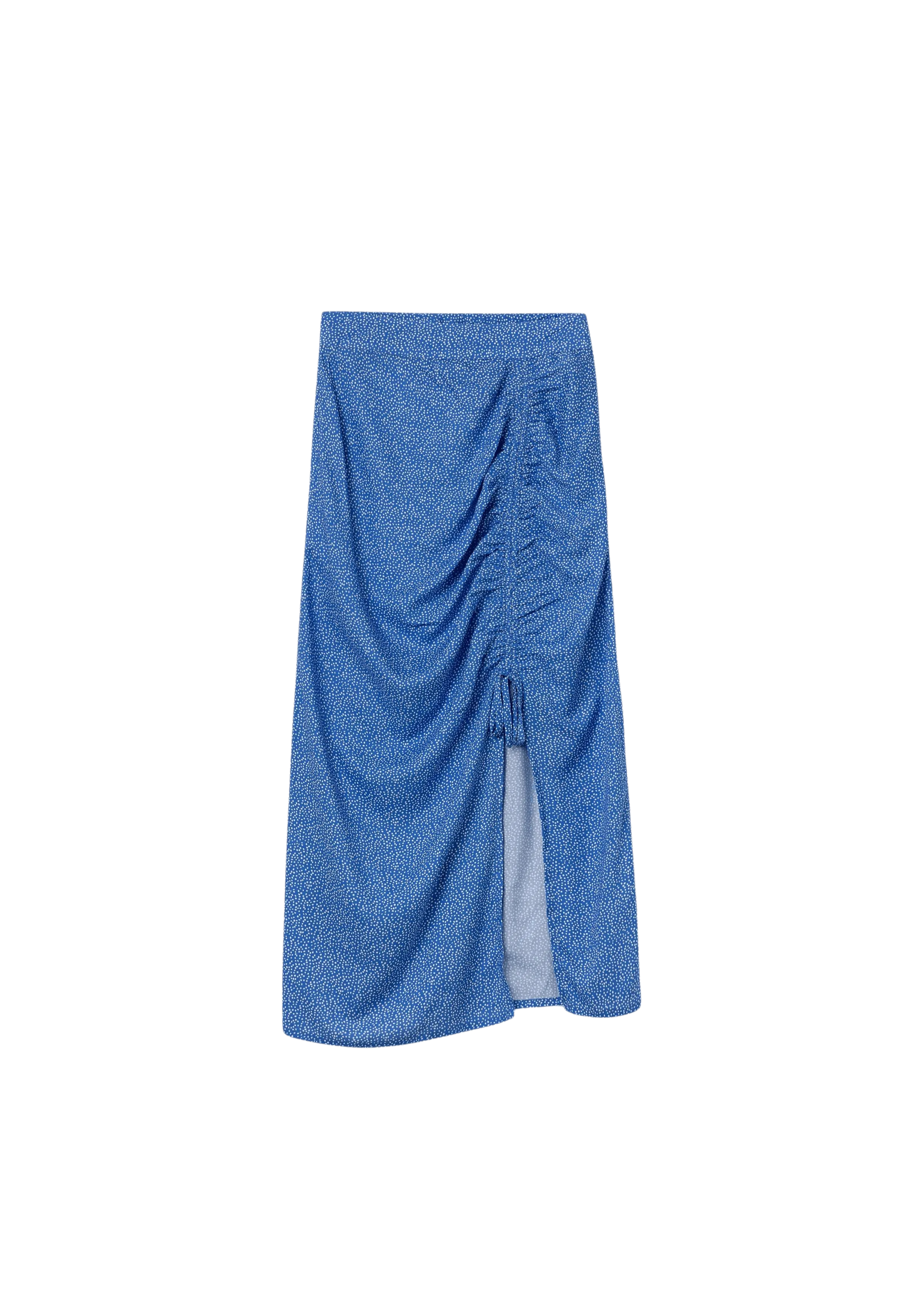 Falda de tiro alto y detalle de frunces ajustable. Abertura frontal. Cierre lateral con cremallera oculta en costura.
